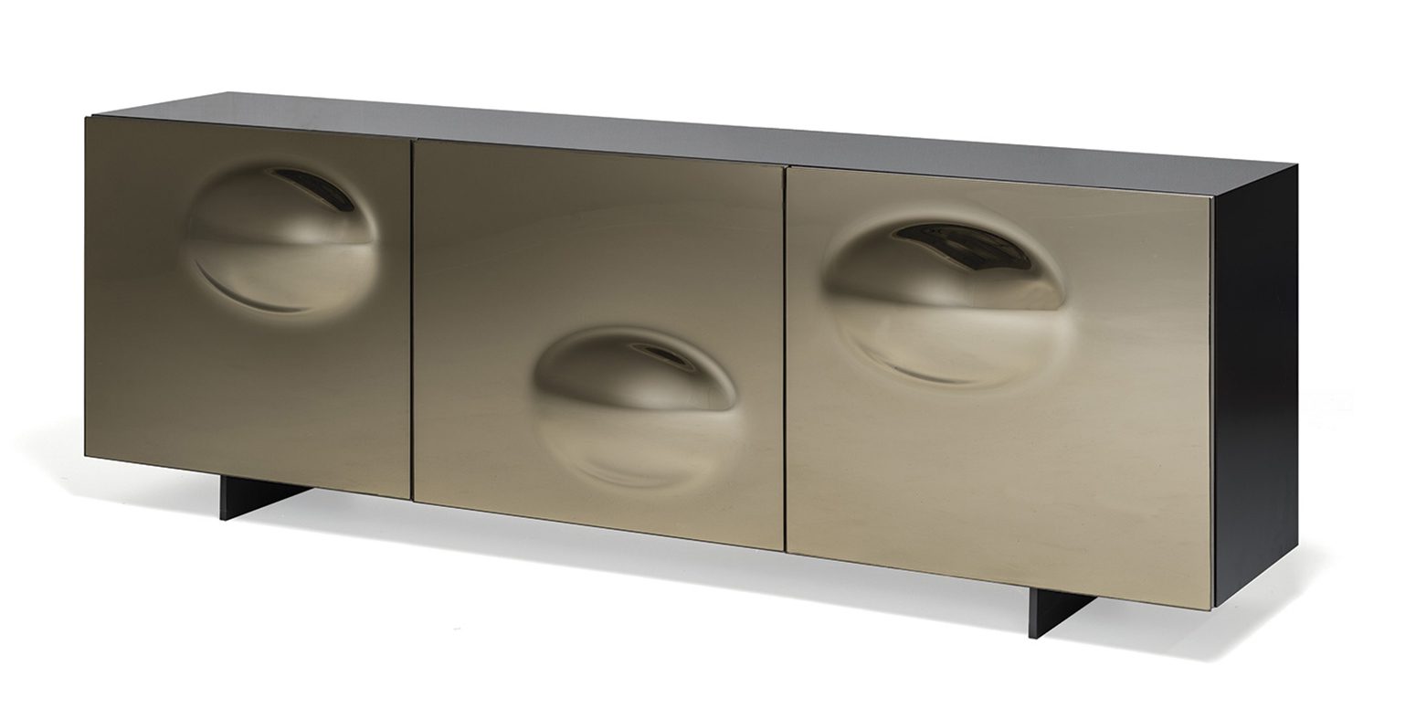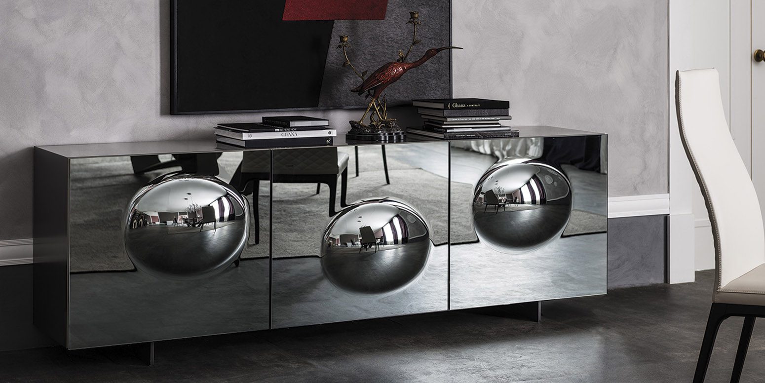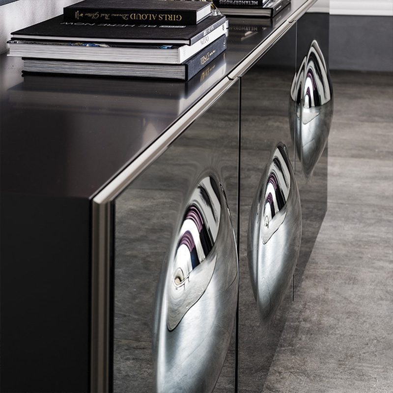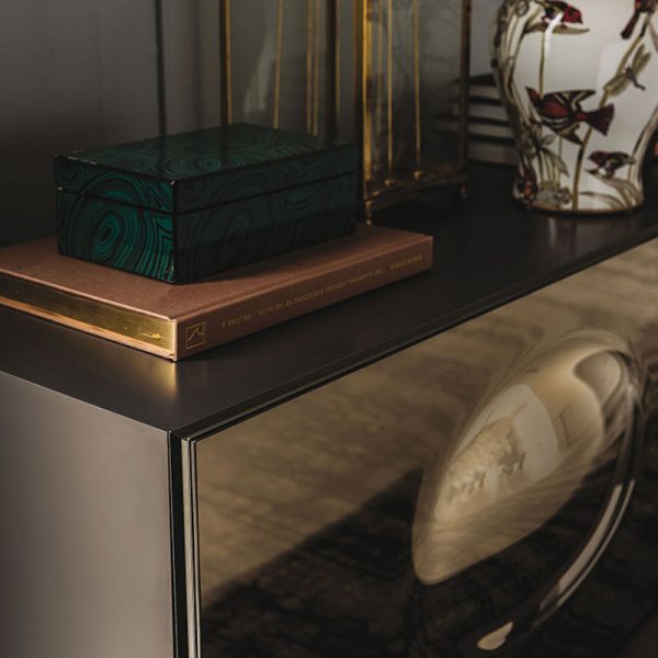 Paramount has an irreverent yet refined design, conceived by Andrea Lucatello. The door’s shape gives volume and rhythm to the structure. They are made of convex mirrored glass, thanks to skilful manufacturing techniques. Paramount is a modern sideboard that can be covered in multiple finishes, matt or glossy; the latter reflecting the surrounding environment with a surreal mirrored effect. The precious materials, which make up the internal and external shelves and the base, underline that this contemporary glass sideboard is the output of high-quality Italian manufacturing.
