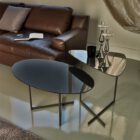 Pat coffee tables are designed to accessorise a design living room with practicality and elegance. Pat comes in two shapes: an oval coffee table and a triangular one with rounded corners. The painted glass top subtly reflects the surrounding environment. The base of these modern living room coffee tables is in painted steel and consists of two thin crossed legs. The contrast between the soft shapes of the tops and the angularity of the base creates a pleasant contrast of styles. By combining these design coffee tables with different shapes and finishes, it is possible to create a composition that gives rhythm and dynamism to the room.