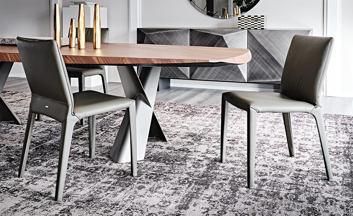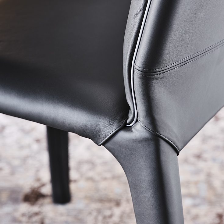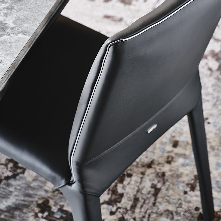 The design chair Penelope provides the highest comfort of a modern chair manufactured with the finest materials. The integral cover in fabric, synthetic leather or soft leather is available in a variety of colors, with matching stitches that enhance the seat shape. At the same time a thin decorative metal profile in gunmetal grey underlines the shape of the backrest, which is fully upholstered.