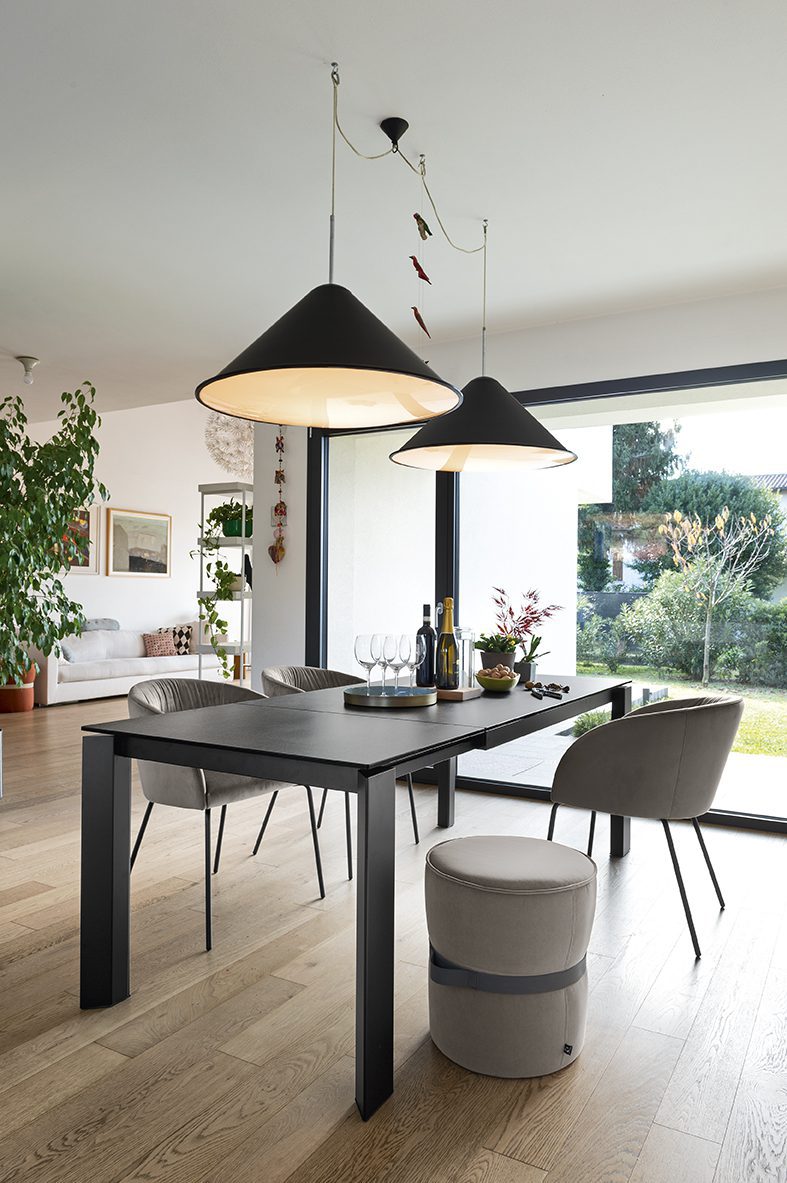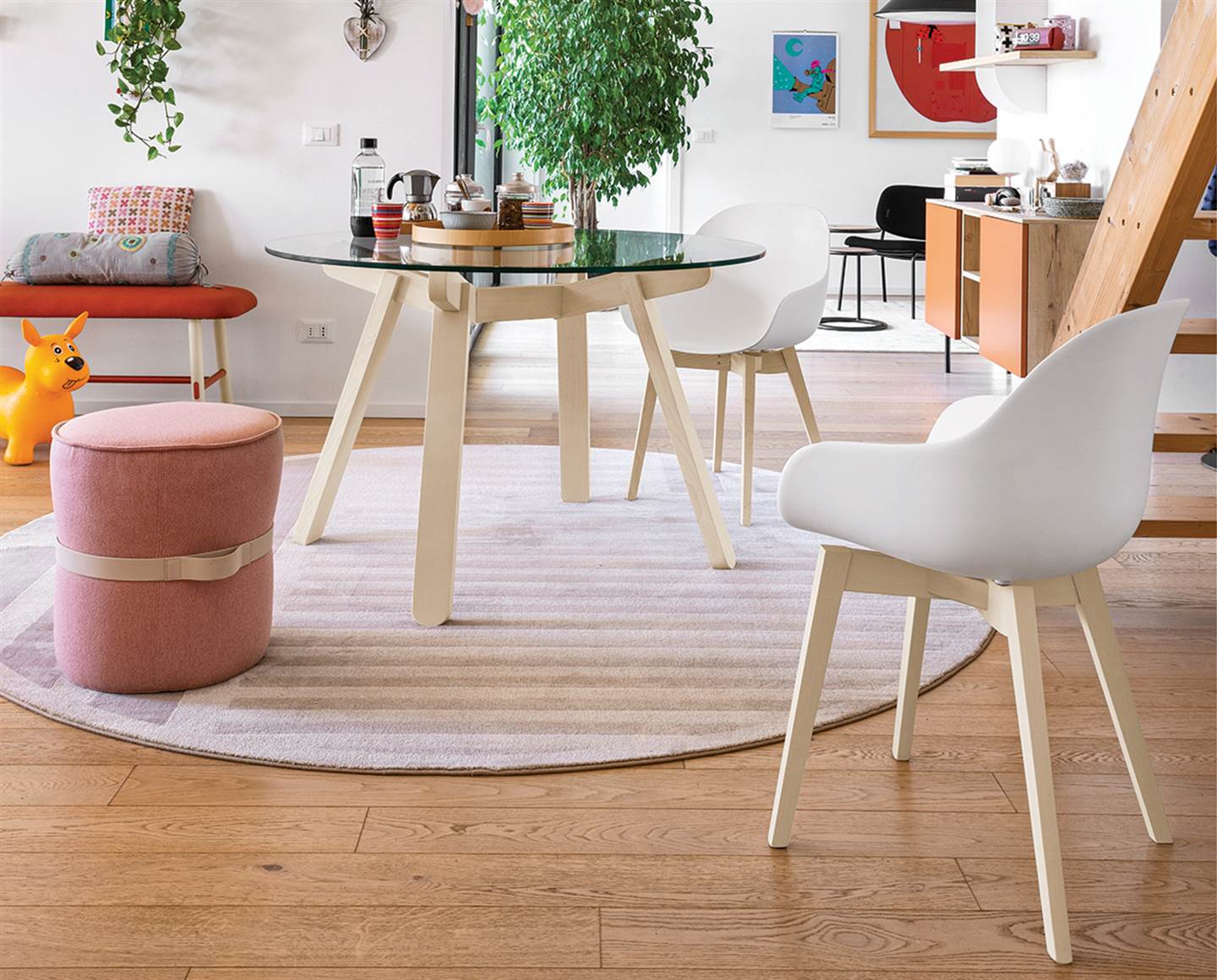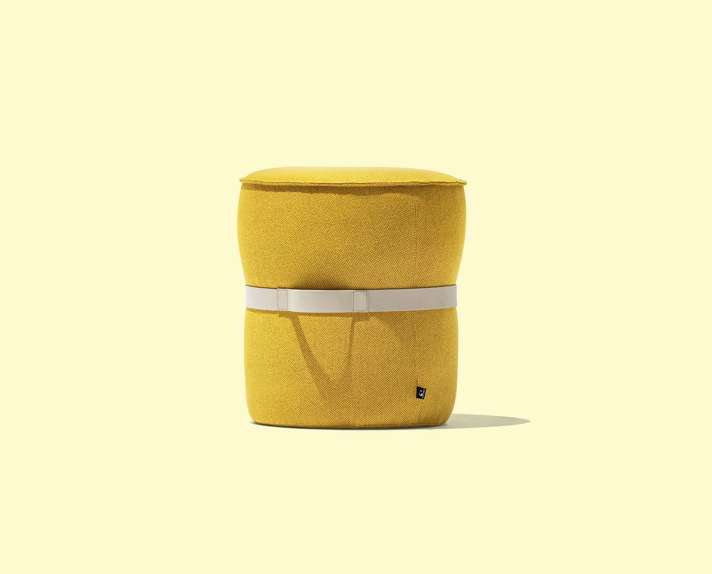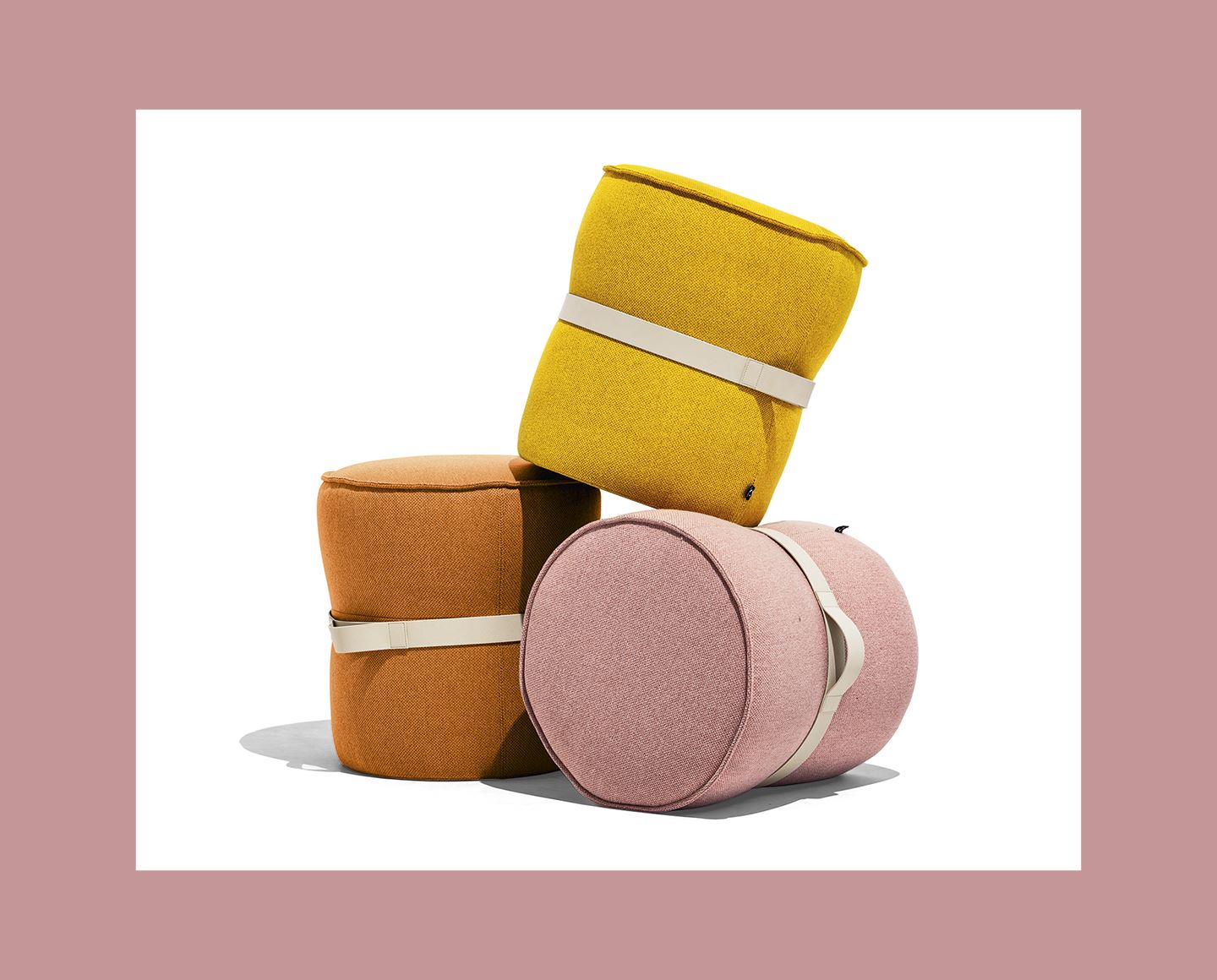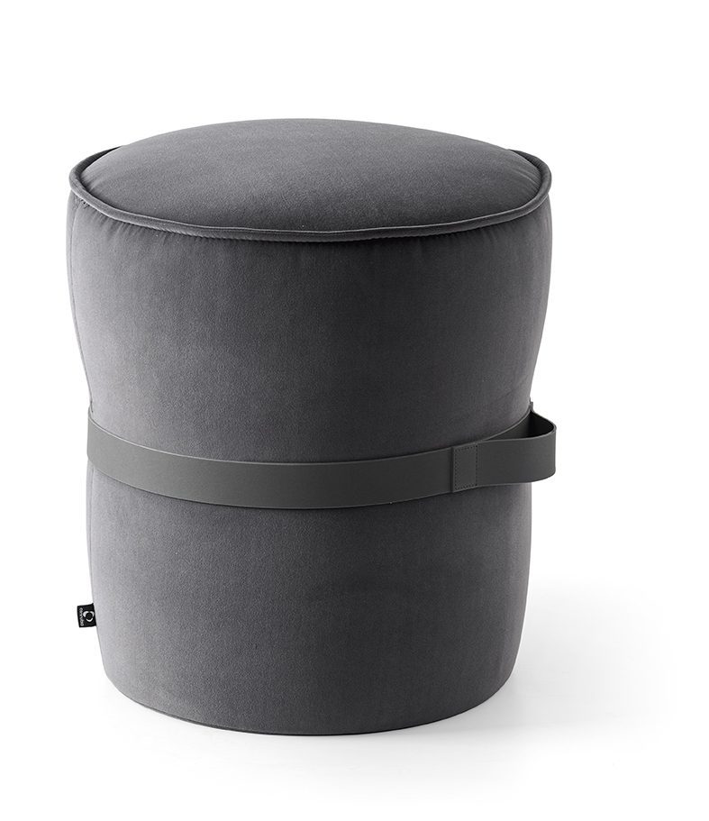 Fully padded round footstool upholstered in fabric with pinched seam detailing around the seat edge.