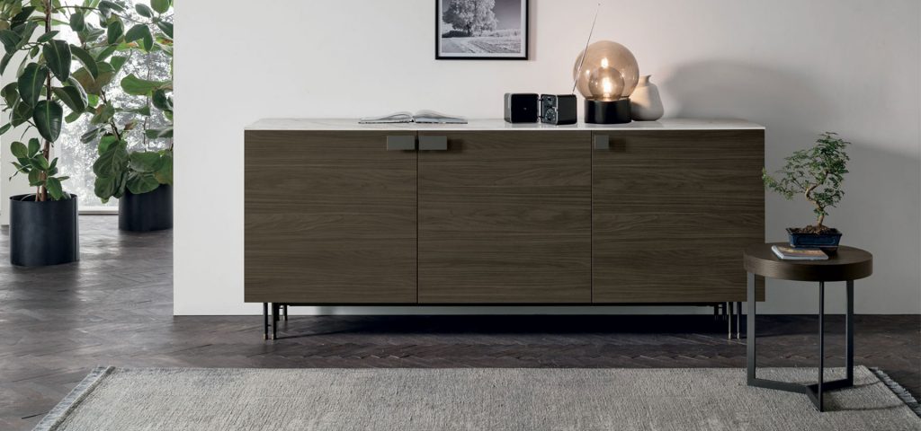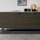 A linear design supported by an original base with double legs and made more precious by the metal handles, which can be either square or rectangular in shape: this sideboard expresses itself through geometries.