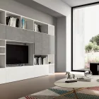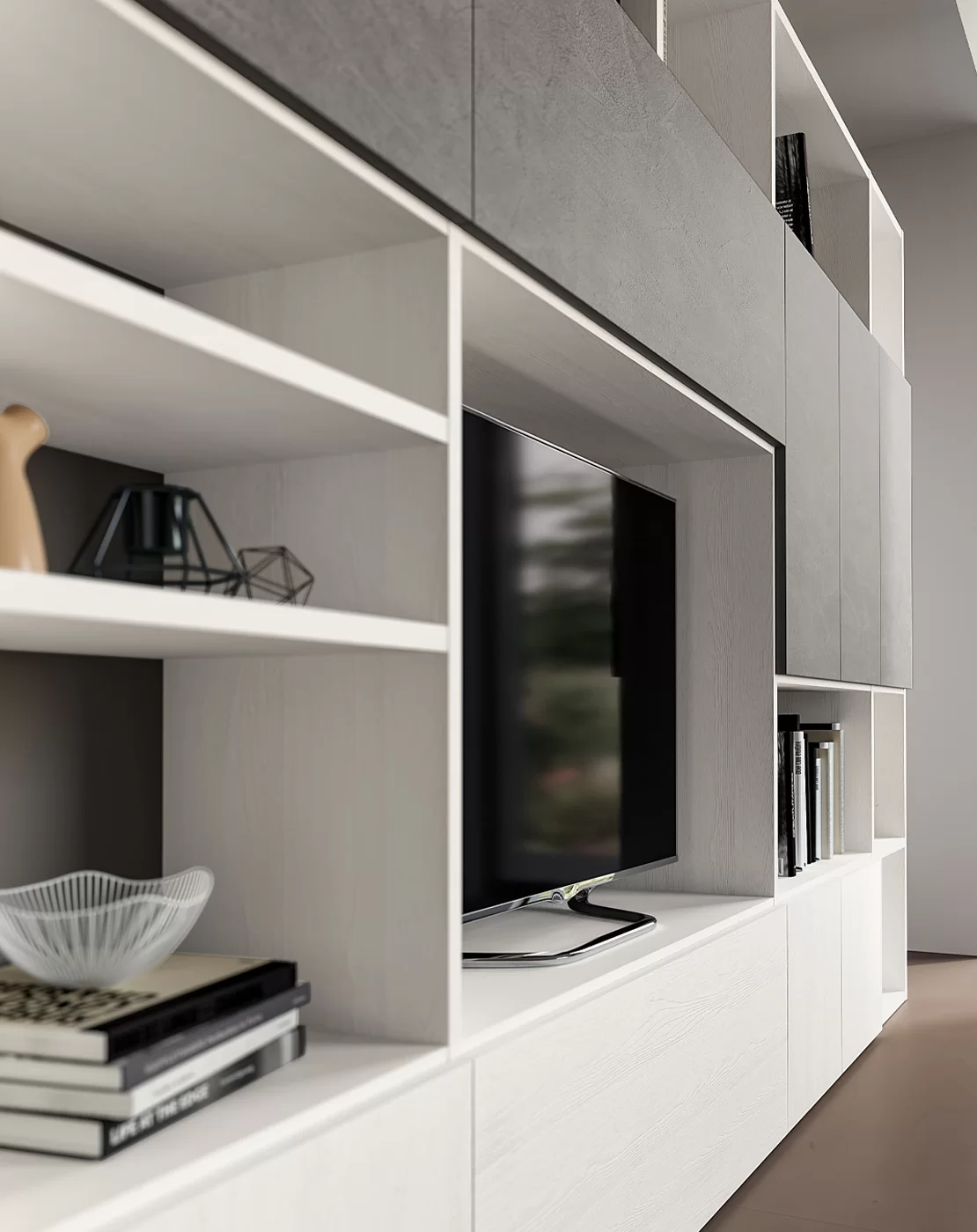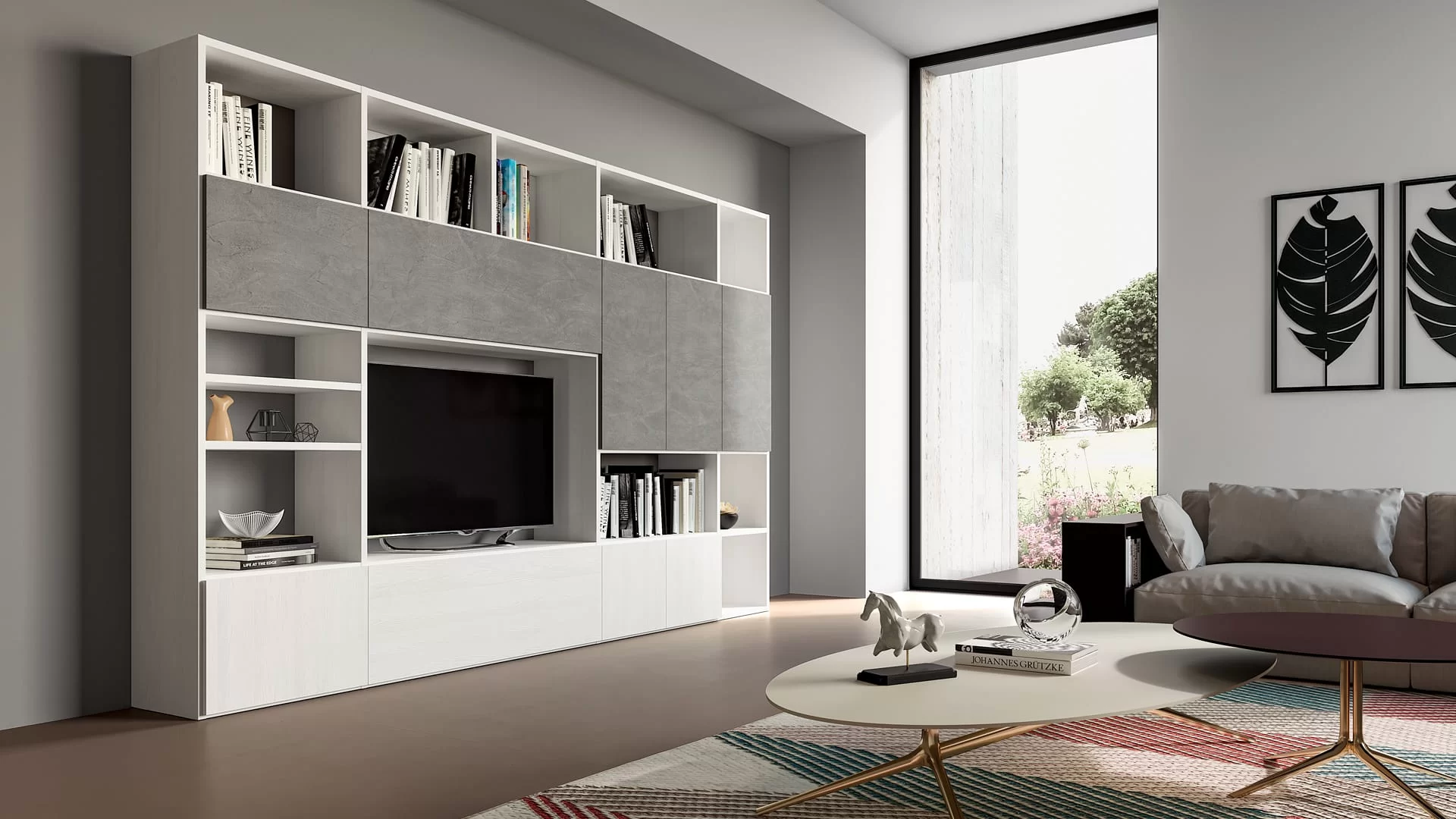 Open and closed horizontal and vertical spaces feature on this bookcase with a geometric, functional look. The textured Materia Cemento finish on the doors decorates the bookcase and