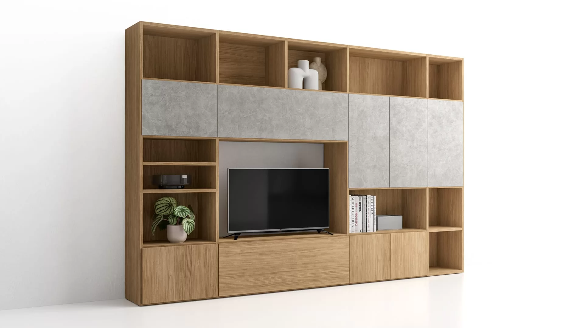 Bookcase with TV compartment, bookcase columns and doors in various sizes, finishes and openings.
