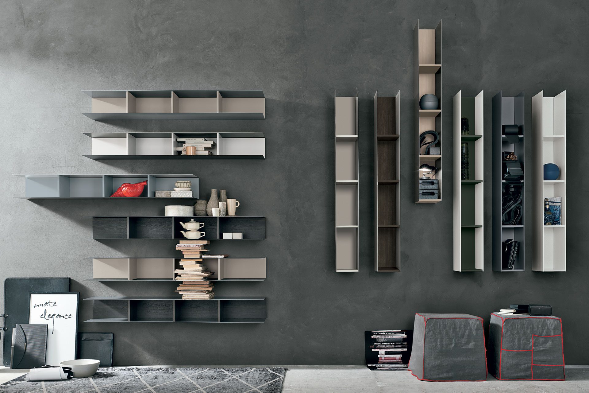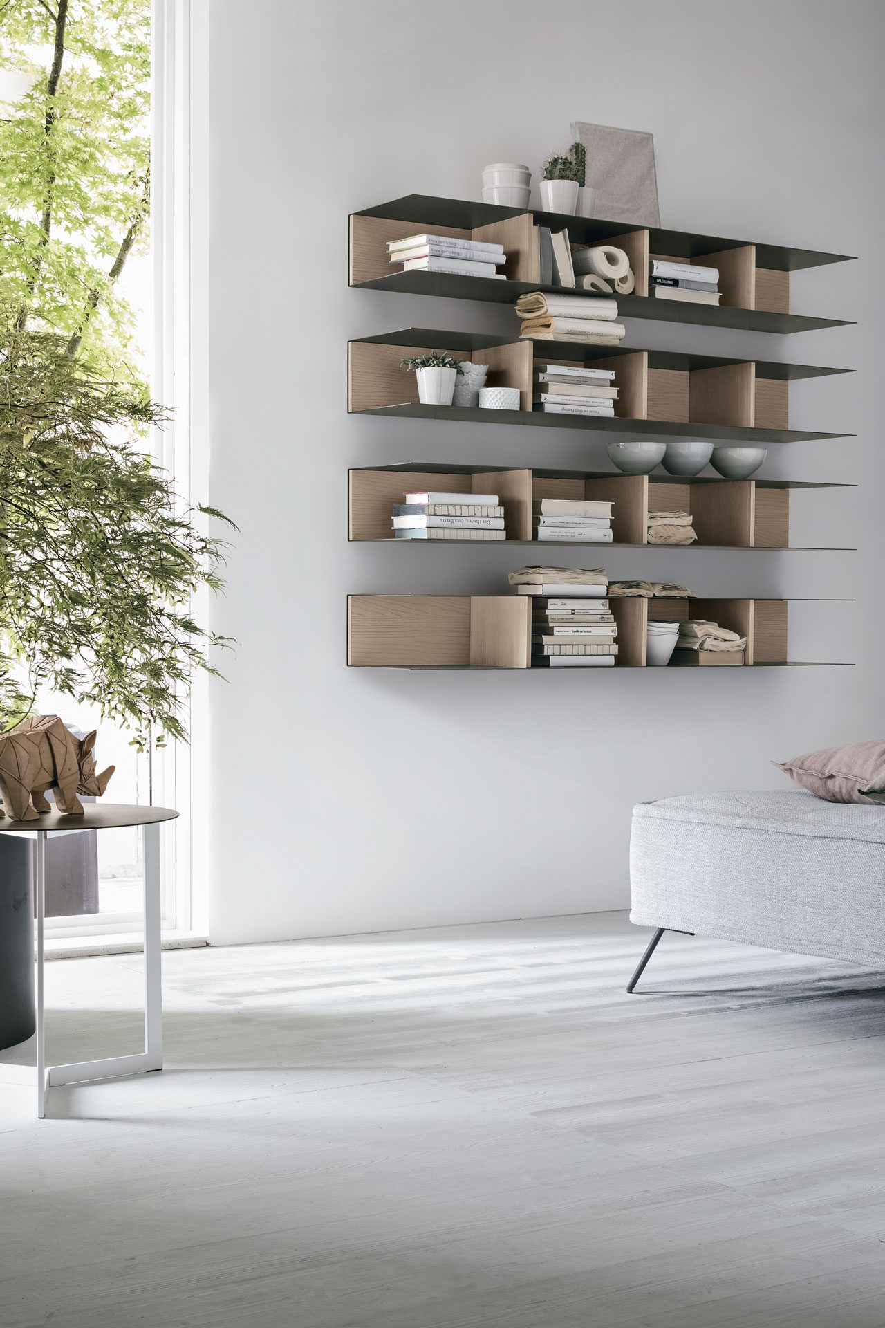 A furnishing element in several colour and finish combinations which, through a game of shelves and geometries, becomes a valid idea for organising the empty space of a wall and creating a bookcase that answers interior design tendencies.