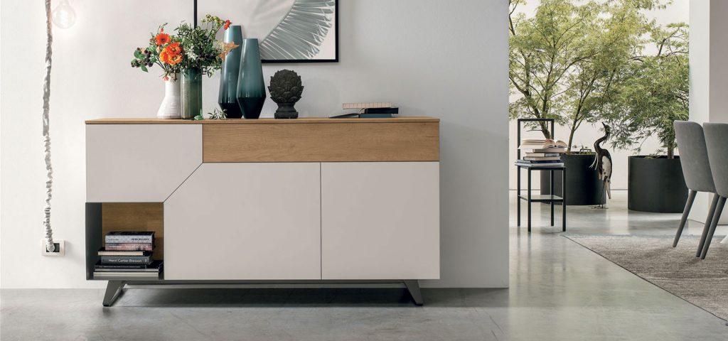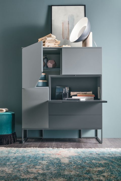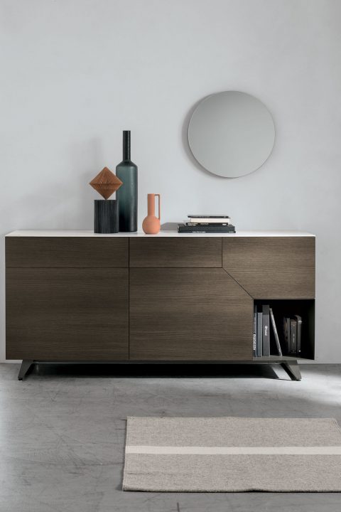 Madia Remix X01 struttura laccato opaco carta da zucchero 155 e bromo 176. Basamento metallo laccato bromo 176.