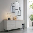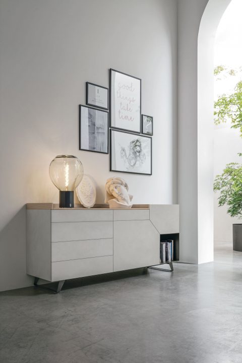 Remix X05 sideboard with textured light cement carcass, Sir sand oak wood top and anthracite 160 metal base.