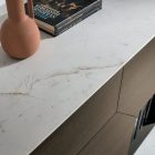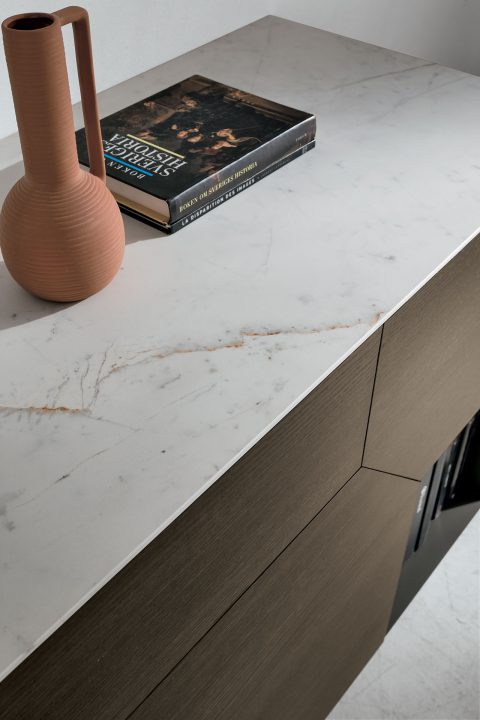 Madia Remix X02 struttura materico rovere moka. Top in gres Abu Dhabi Silk 071. Base in metallo antracite 160.