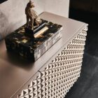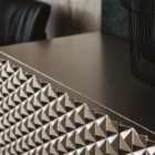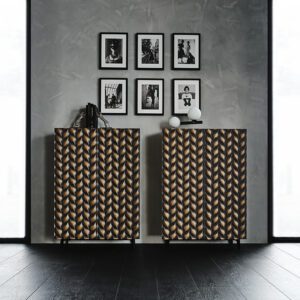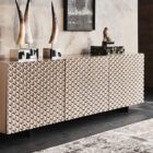 The modern sideboard Royalton is made up of a composition of three-dimensional volumes, forming a geometric pattern that is enchanting and hypnotising. This decoration is on the painted polyurethane doors, creating a fascinating chiaroscuro effect. The designer sideboard is made with 2 or 3 doors and in two different heights, to easily adapt to any room in the house, with a refined style and the attention to detail that is the hallmark of Italian manufacturing.