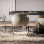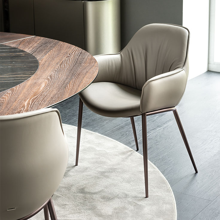 This dining chair with armrests is available in several variants. The Scarlett ML model with metal legs is lighter and more manoeuvrable than the Scarlett Wood version, which features legs made of attractive, high-quality wood.