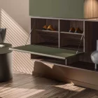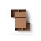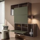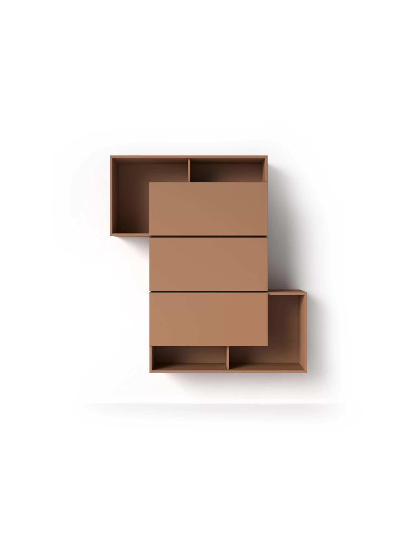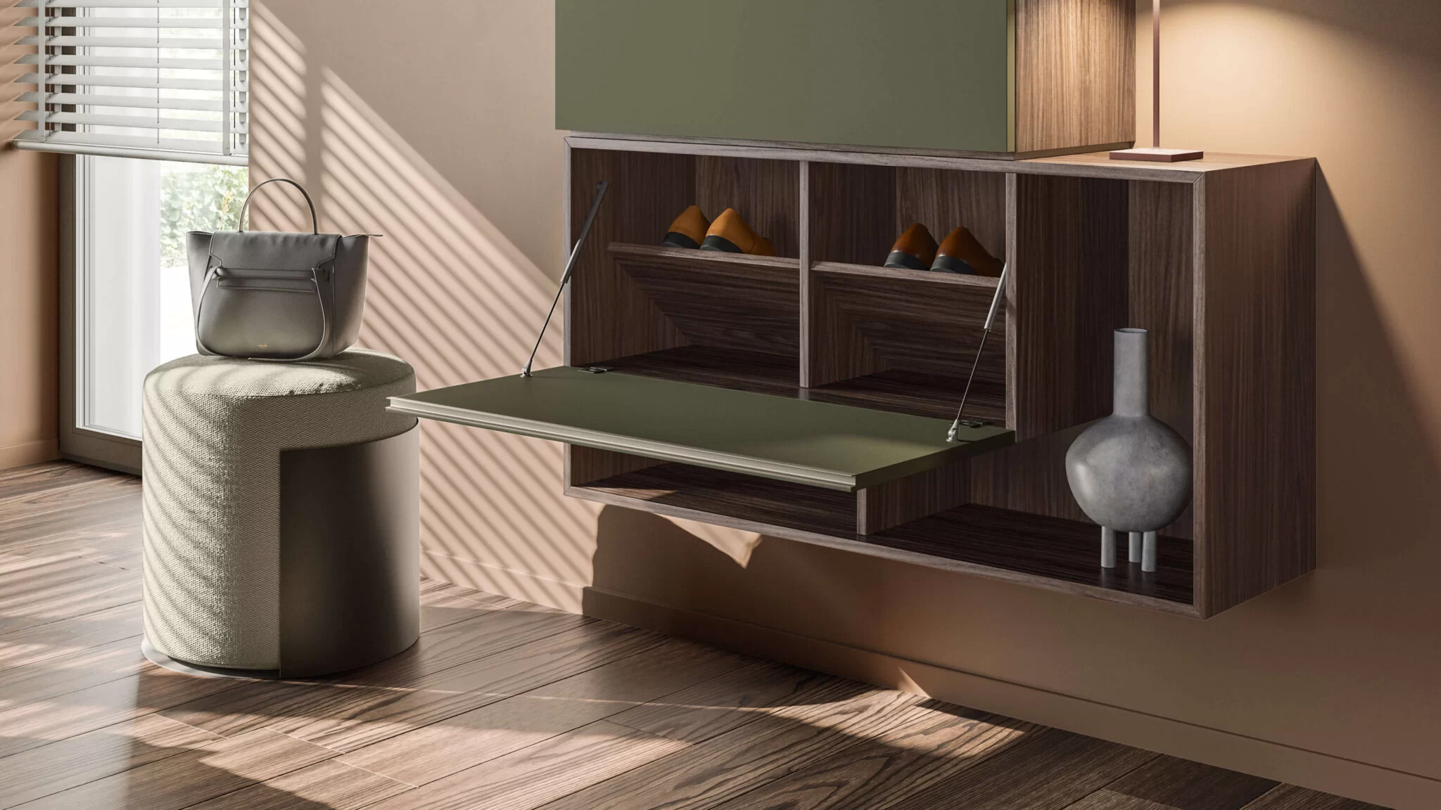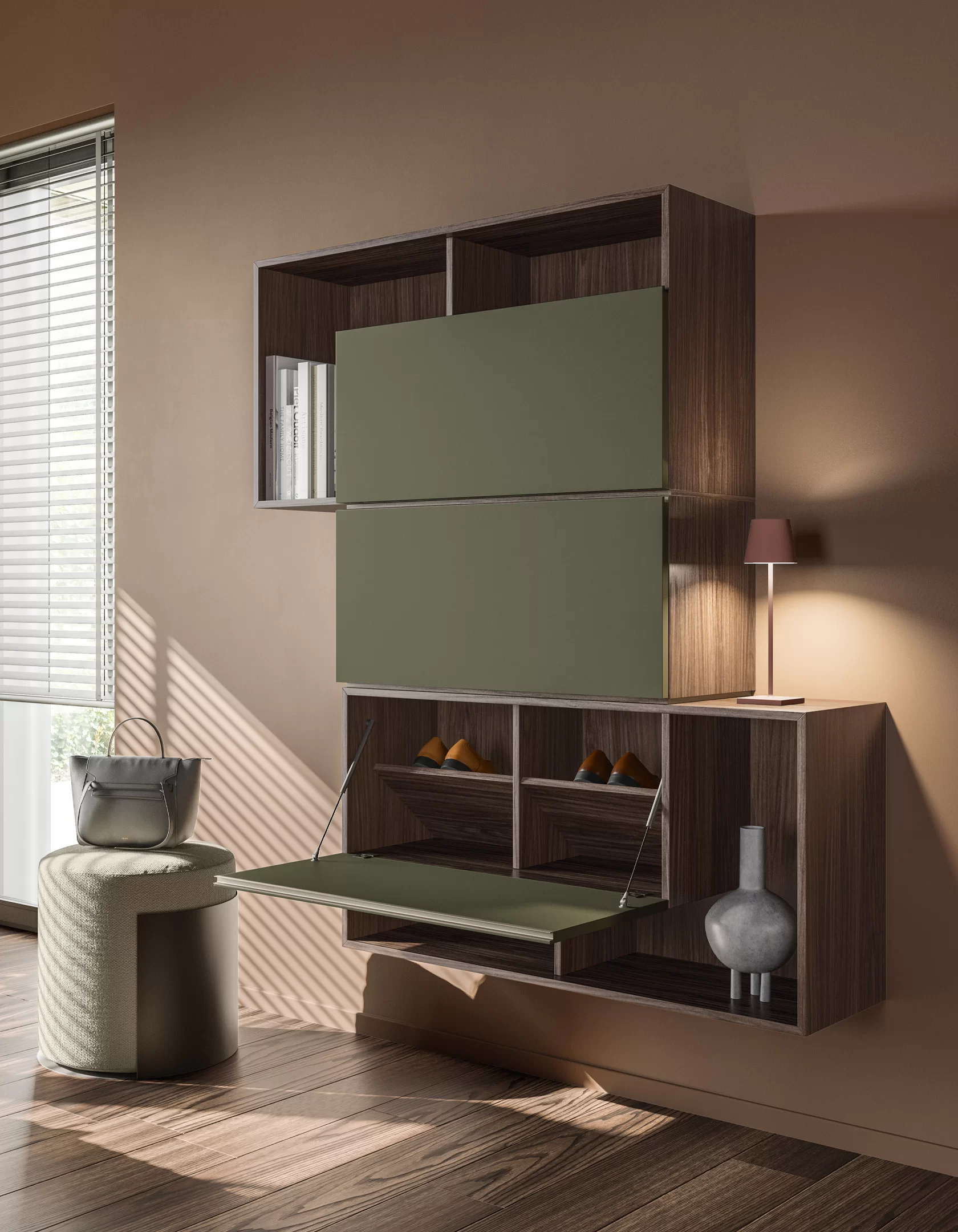 Wall-mounted shoe organizer for an entrance space. It features staggered open compartments in different sizes and closed compartments with sloping shelves.