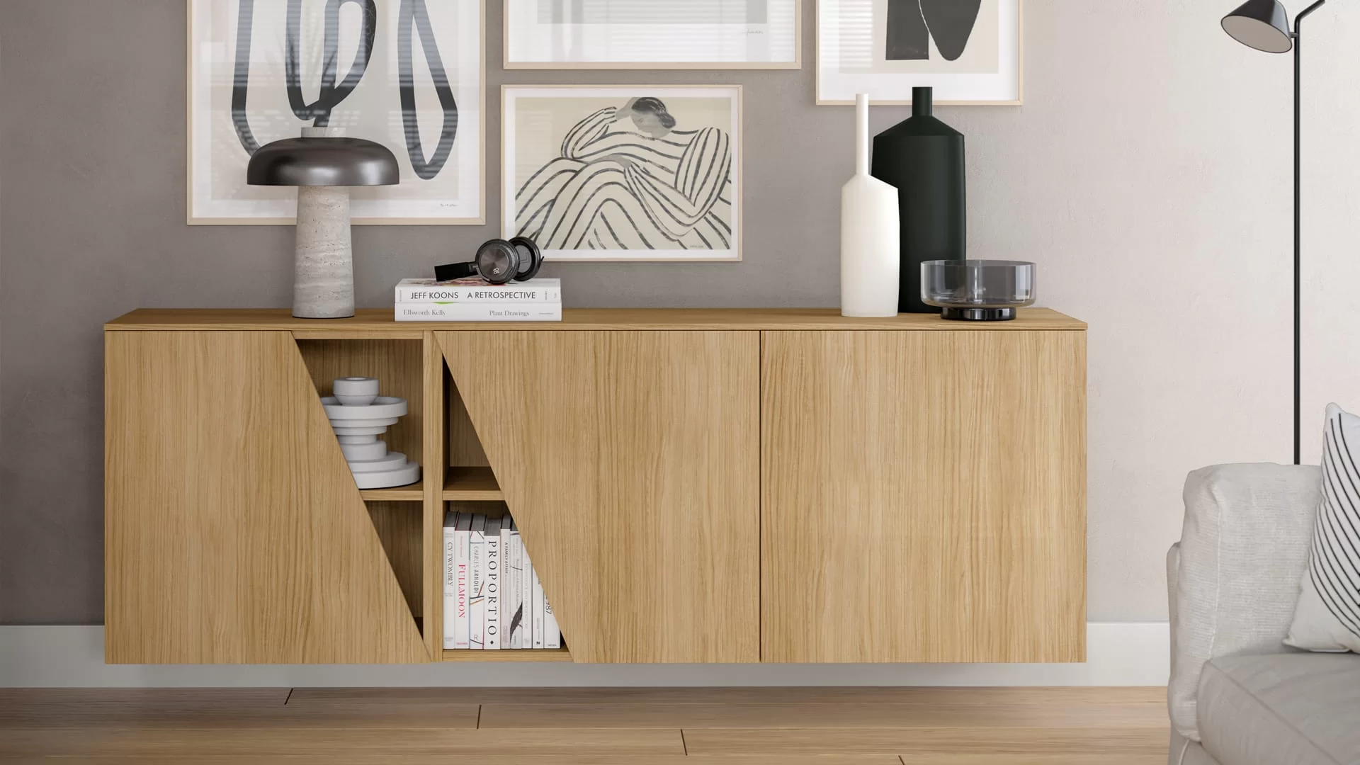 Oblique-cut doors bring dynamism and originality to the space this sideboard inhabits.