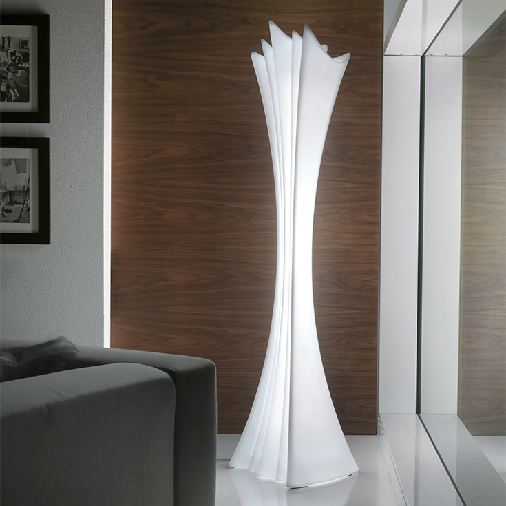 The design of the modern lamp Sipario Light takes inspiration from the draperies of a voluminous fabric. The soft shape made of white polyethylene manages to restore movement and fluidity to the material. The sinuous and graceful surfaces of this design lamp, which turns into a coat rack when needed, create natural and elegant light and dark shades.Sipario Light perfectly meets the needs to which it is addressed. It is fully illuminated and adjustable on both sides and has 8 hooks on which to hang clothes.