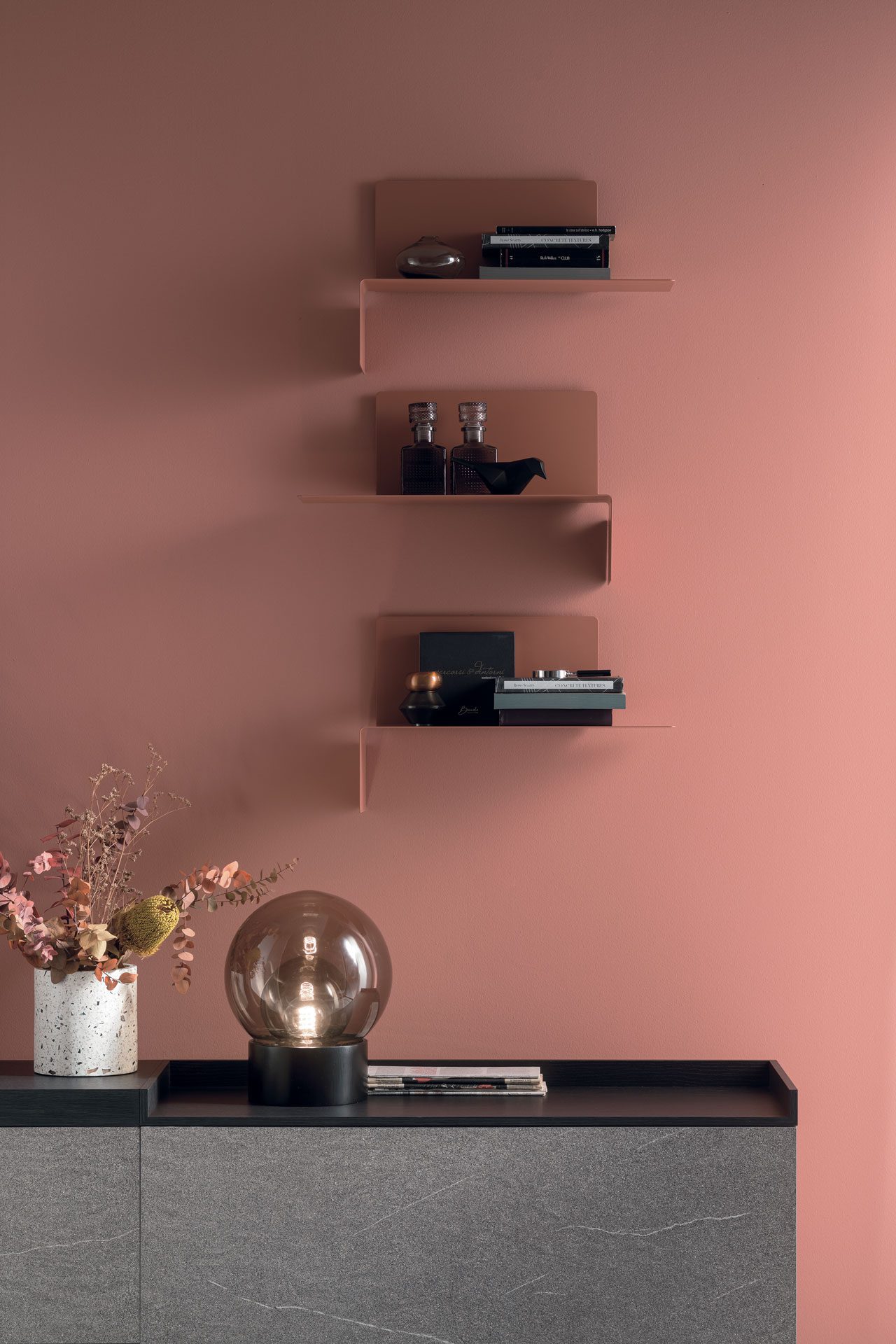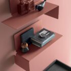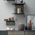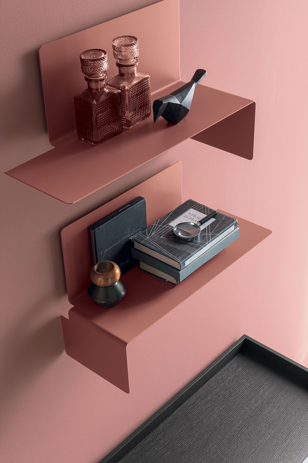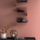 This metal shelf is a true furnishing plus and can be fixed right side up or upside down to generate creative arrangements on any wall and in any room. When the folded side is turned upwards, it acts also as a practical bookend.