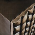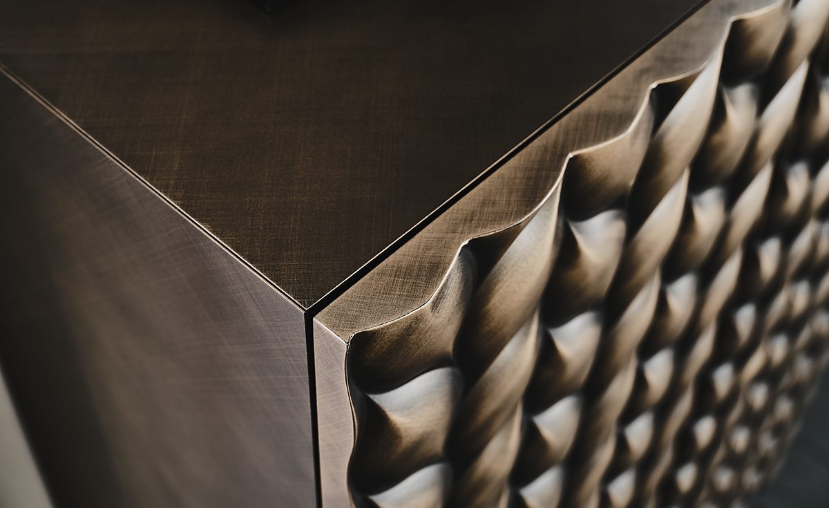The Spiga sideboard has a strong three-dimensional nature. The doors’ decoration enhances the metallic lacquered finish, creating a pattern of sharp lights and shadows. The irregular yet silky surface has a satisfying feeling when passing the hand over the doors. This modern cabinet owes its sophisticated style to the excellent Italian manufacture, which crafts exquisite details and finishes. The sculptural taste of this elegant sideboard is conceived to decorate convivial spaces of refined homes, hotels and restaurants. In the inside, the Spiga tall cabinet is valorized by a mirror.