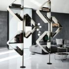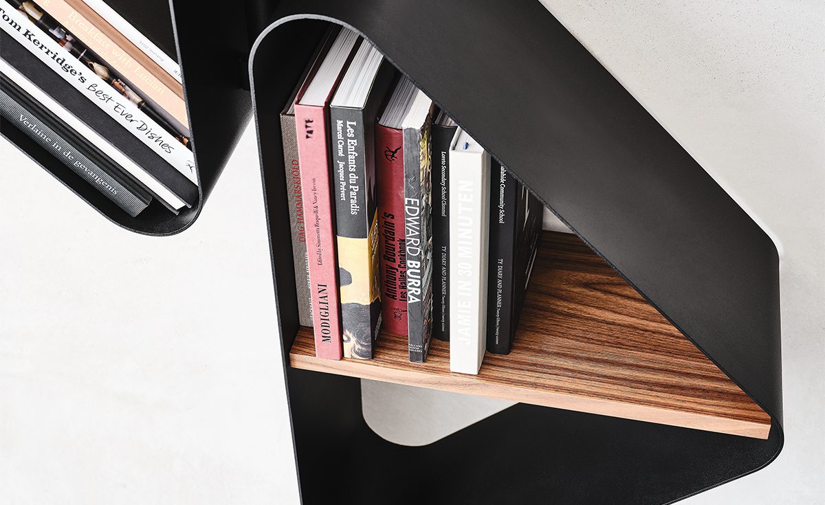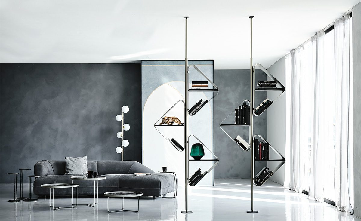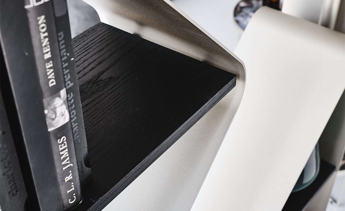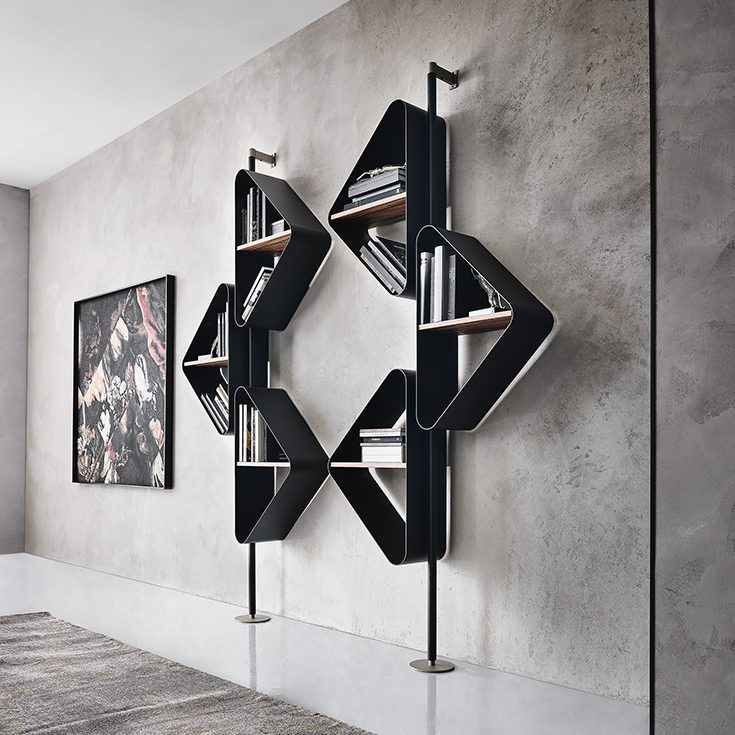 Conceived by Tosca Design, the Spinnaker design bookcase appears incisive and disruptive. When placed in the center of a room, this modern metal bookcase can become a decorative column. The name comes from a type of sail that stands out on the horizon among the waves, and so does this bookcase in the living area. As an alternative, when fixed to the wall, this original design wall bookcase is suitable for furnishing a living room, a bedroom, an office or an elegant waiting room.The lacquered steel with metallic and bright finishes is further embellished by the precious wooden shelves, showcasing the natural grain of the raw material.