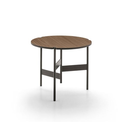 Round Moon coffee table in amber walnut CDF, anthracite 160 metal structure.