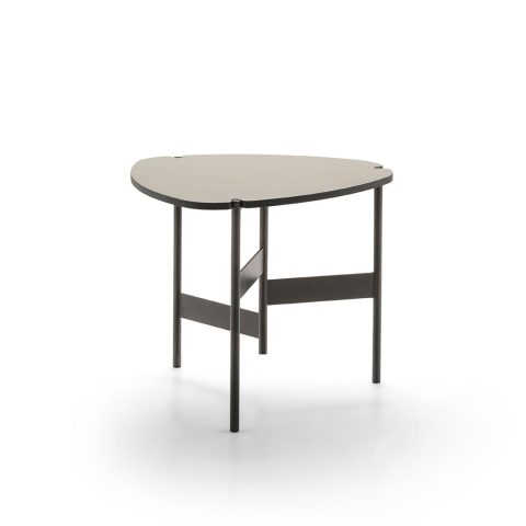 The boldly dynamic metal base firmly holds up the top in its different shapes and finishes. Even on a small piece of furniture, the exposed black edges make a big impact on design.