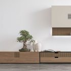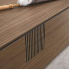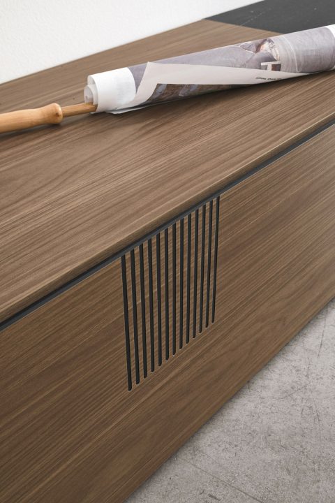 Photo finishes / Reeded amber walnut CDF, amber walnut CDF, veined black CDF, mother of pearl CDF. Shelf in reeded amber walnut CDF, matt mother of pearl 124 lacquer.