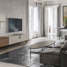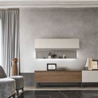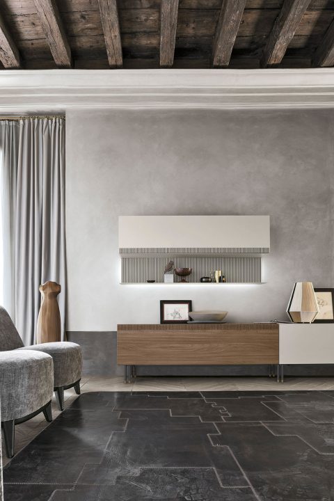 The surface finish creates a special reeded effect that decorates the wall unit, the shelf and the base unit. Time could stop to fix in space the unique style of living room furniture designed to further enhance its surroundings.