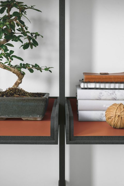 The black shelf edging adds even more personality to the bookcase: instead of being hidden, the core of the material is exposed and enhanced, just like the objects and books displayed on it. In this bookcase, style and function go hand in hand.