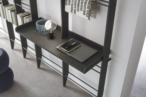 Much more than a bookcase, this one even has a desk. The desk integrated in the structure, paired with a seat, creates a practical home office corner that doesn’t take up extra room and harmonizes perfectly with the rest of the room.