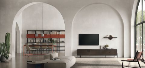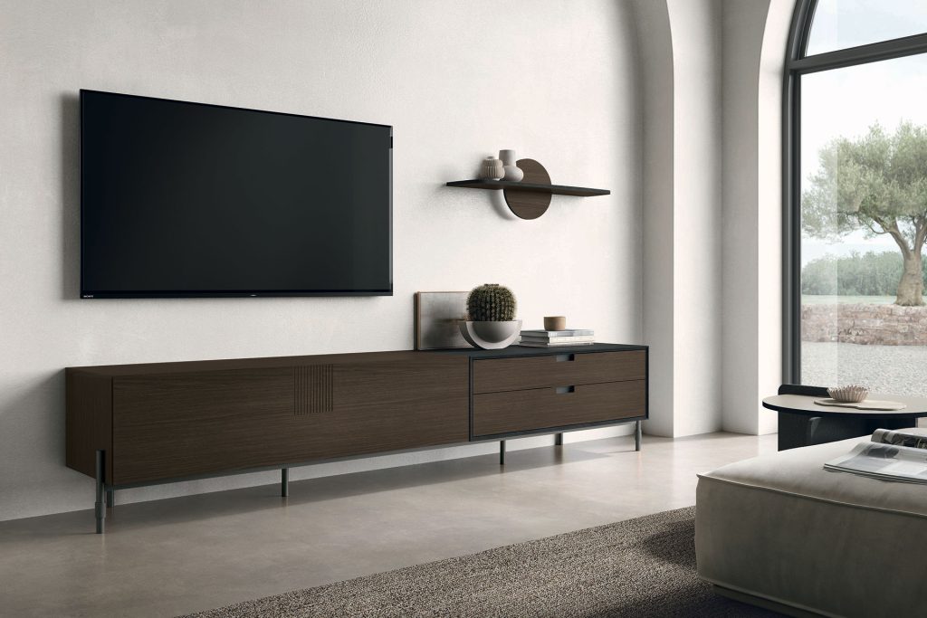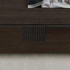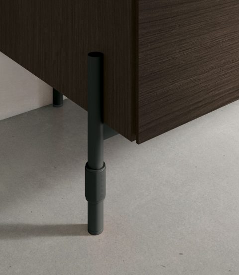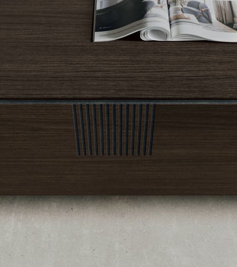 The storage unit in mocha oak cdf is clean-cut and linear yet it stands out for its details: the module with veined black cdf drawers, the vertical incisions that reveal the core of the material and time metal base.