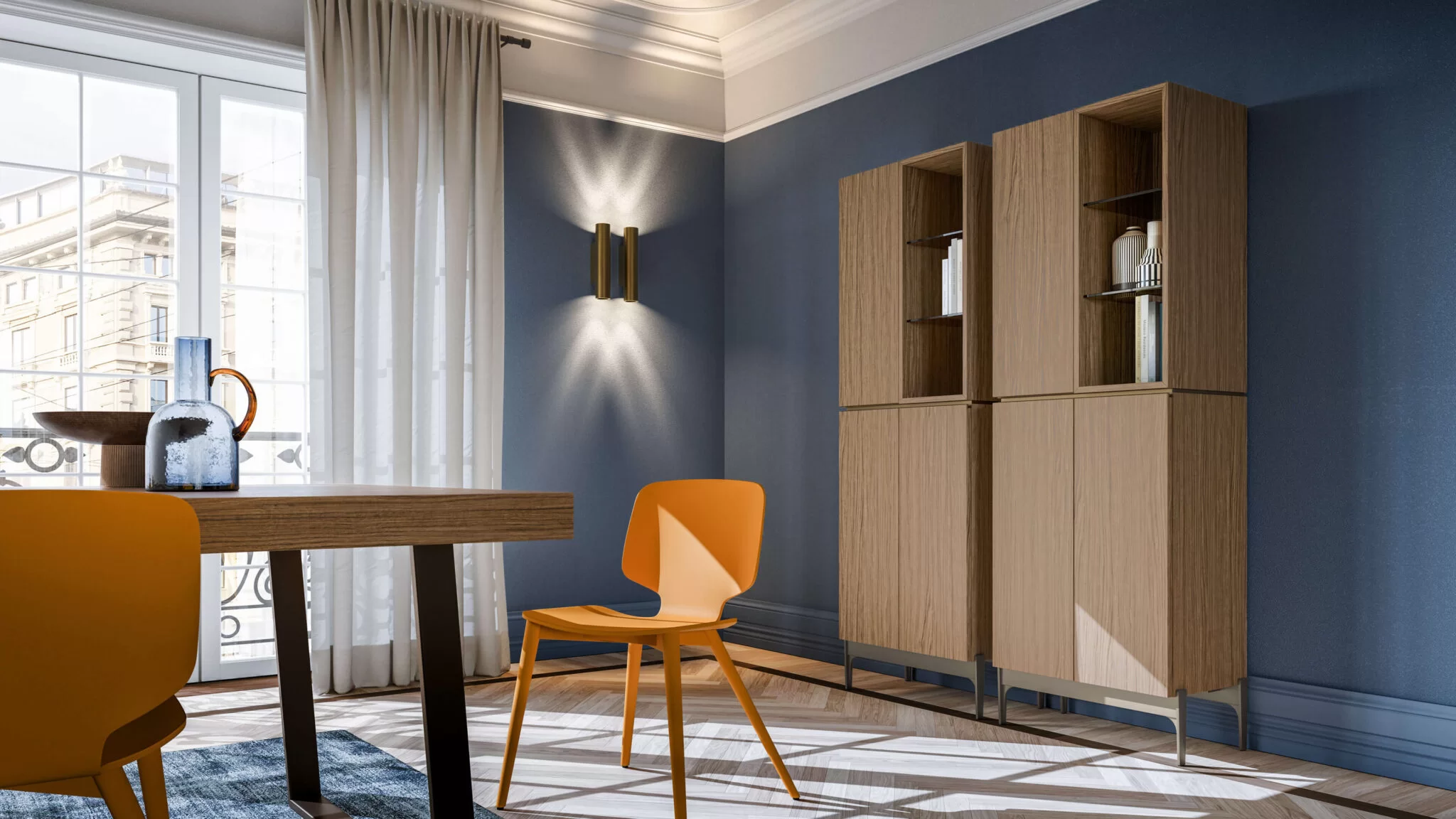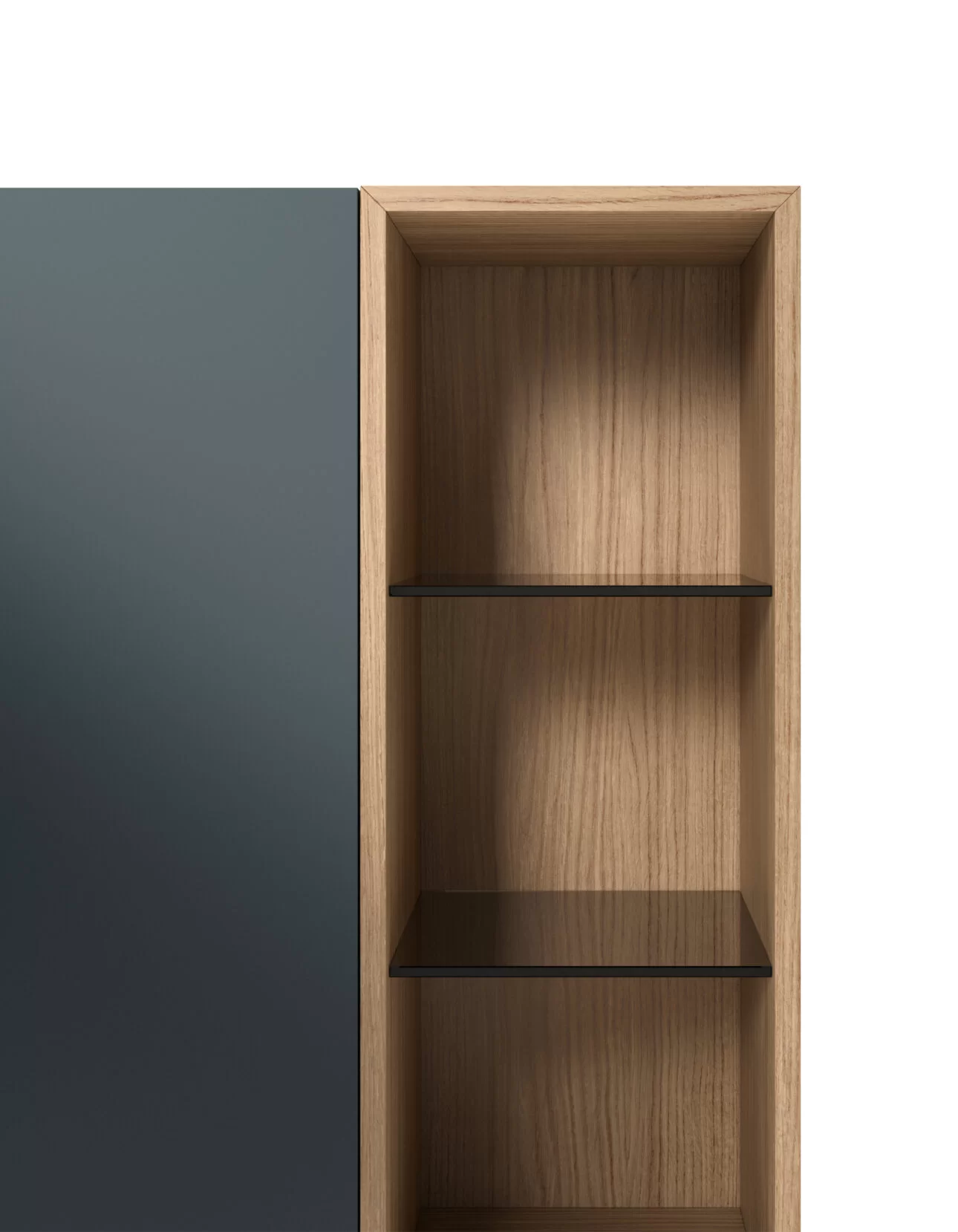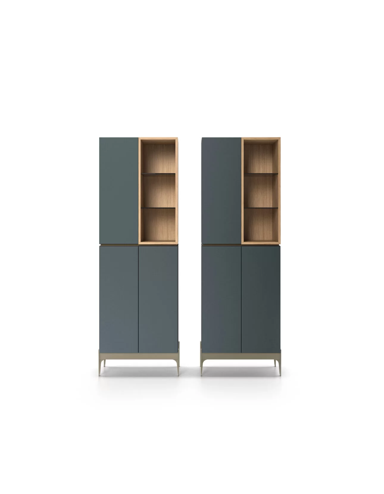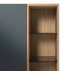 A space-saving interior solution for the living room, optimizing vertical space, with infinite combinations of colors and finishes. An open-fronted module designed to organize storage into various spaces with use of refined Stopsol glass shelves.