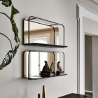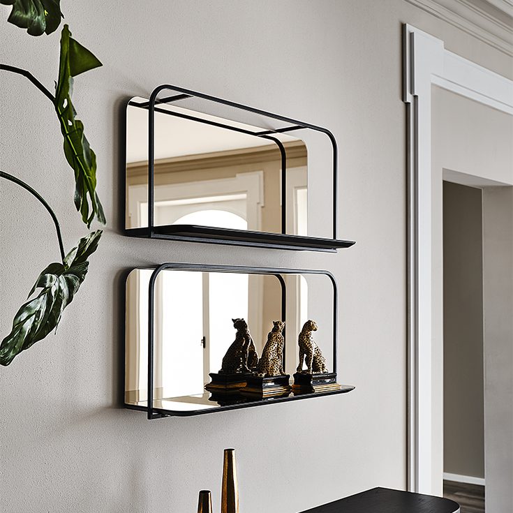Elegant and multifunctional, Tresor can have several purposes. Used as a wall metal shelf, a mirror with shelf, or a modern entrance decoration… whatever its function, this precious design accessory furnishes any room with a touch of modern elegance and uniqueness.