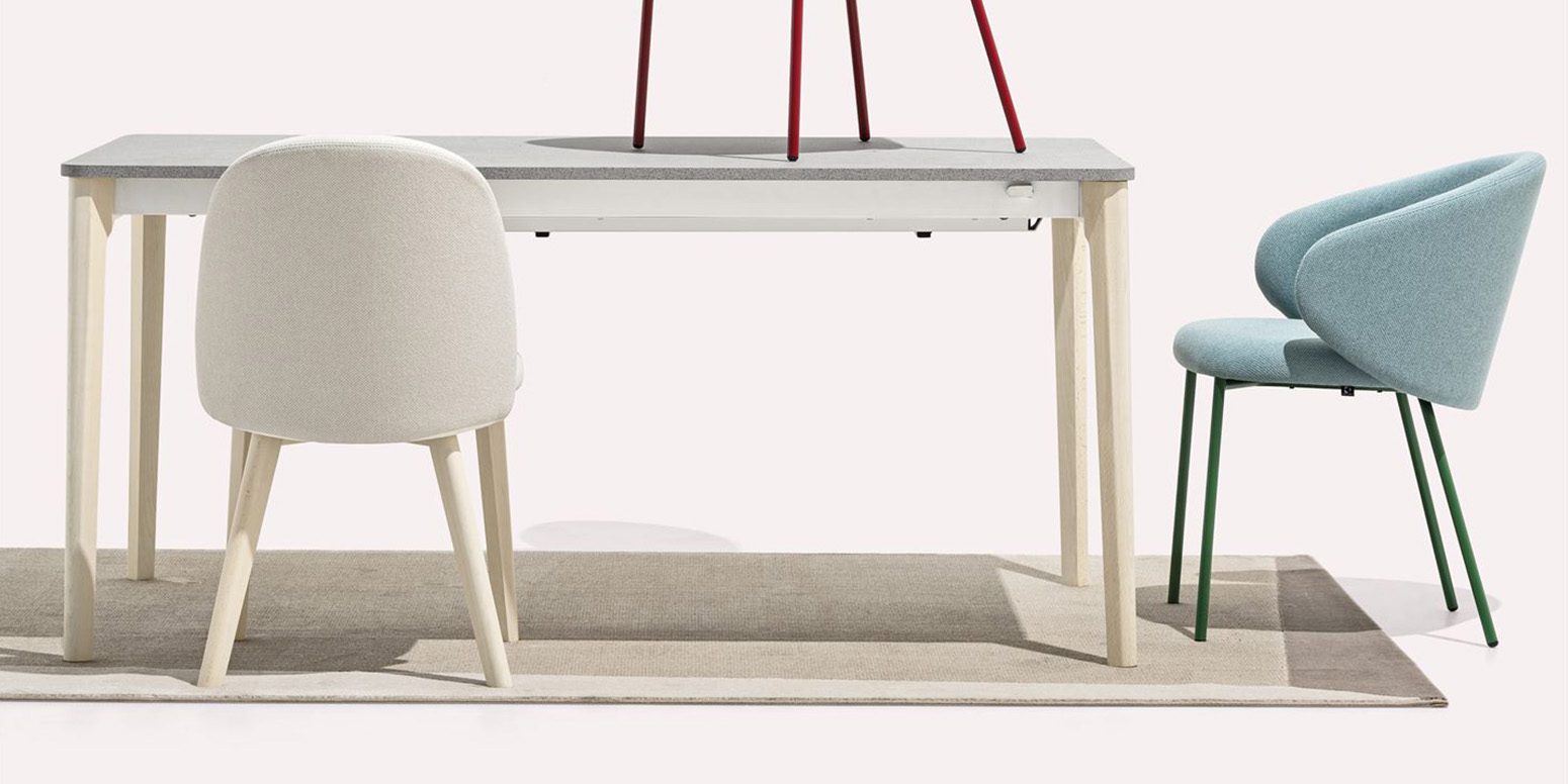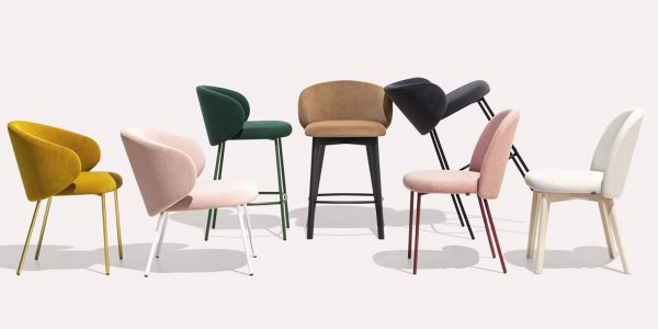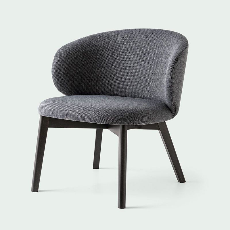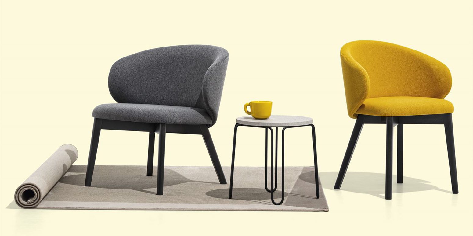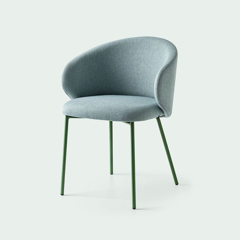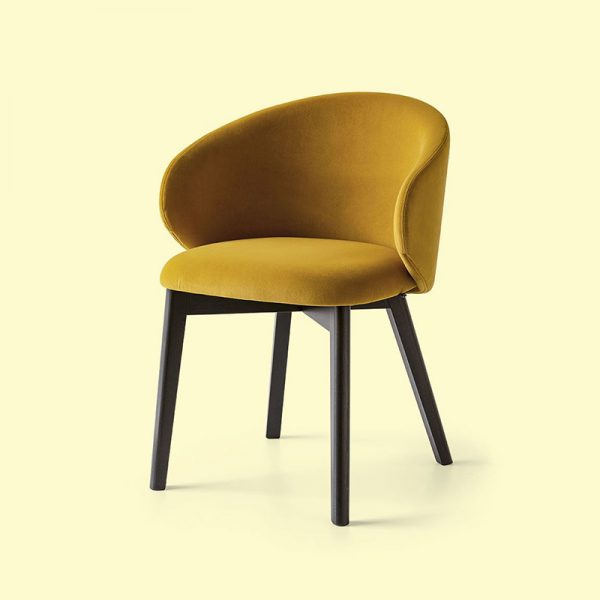 TUKA armchair with 4 wooden or tubular-metal legs, padded seat shell with fixed upholstery, and enveloping wraparound backrest. Also includes the option for a rounded armchair seat.