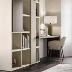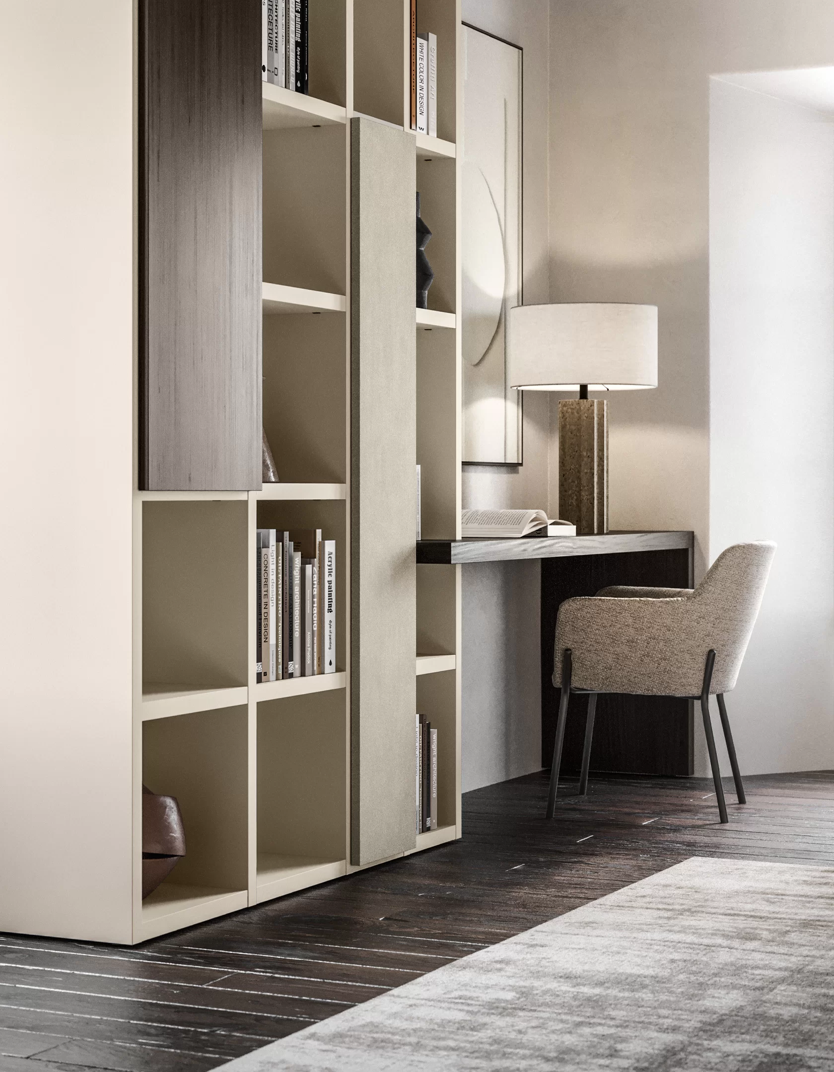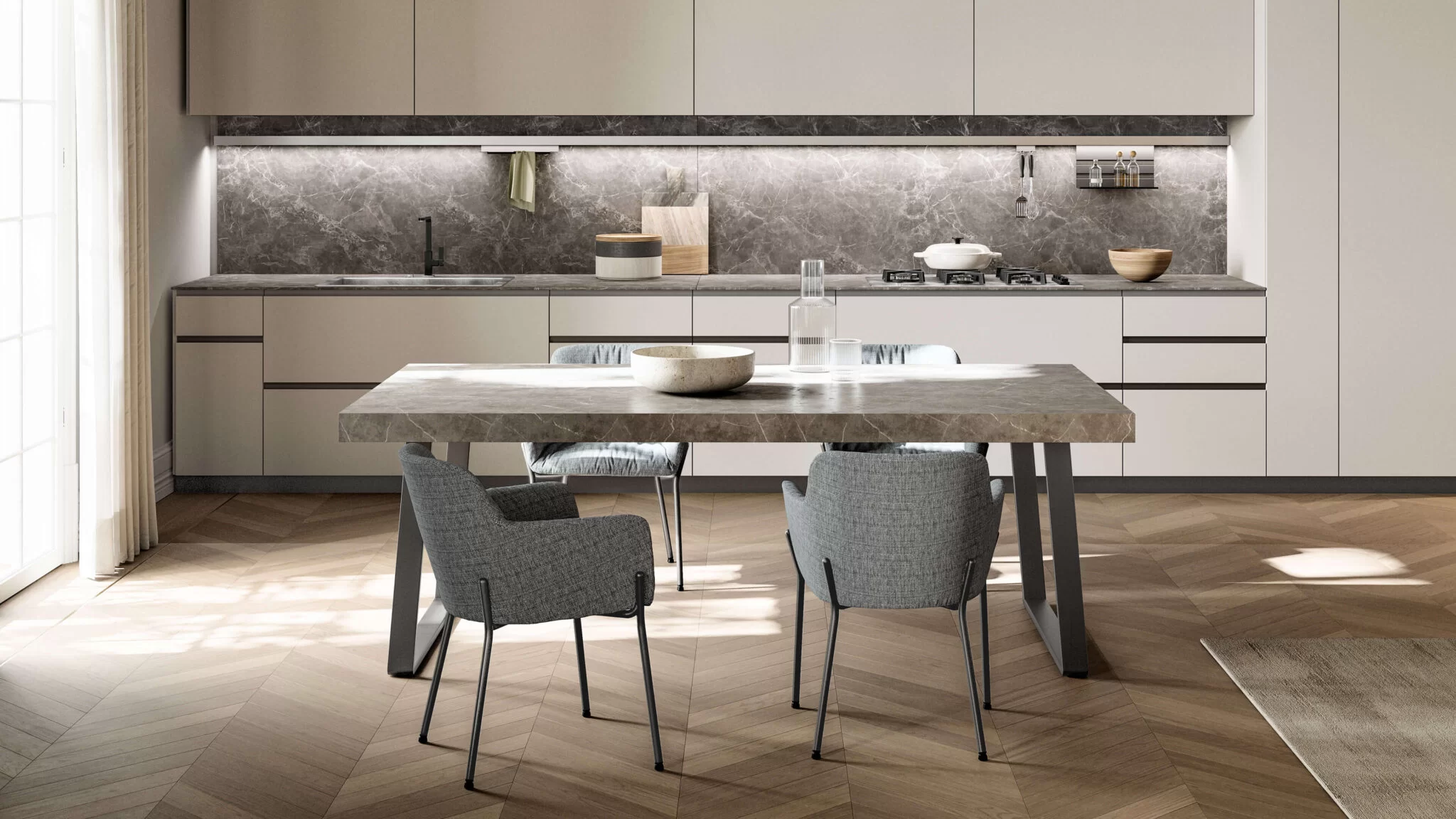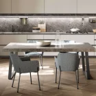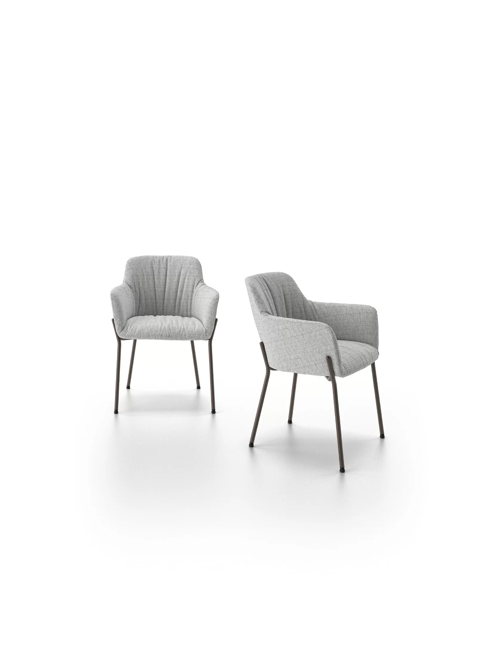 Upholstered chair with embracing lines and visible Titanio finish frame on the seat body. The distinctive design is highlighted by the fabric upholstery, which features a refined draped finish along the backrest, created with soft, loose folds.