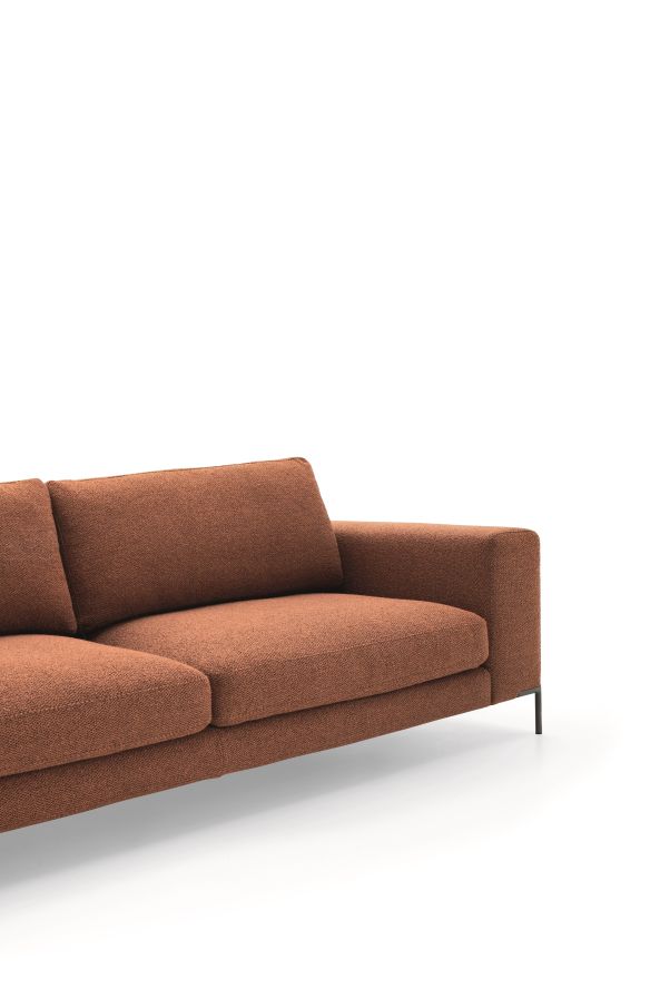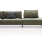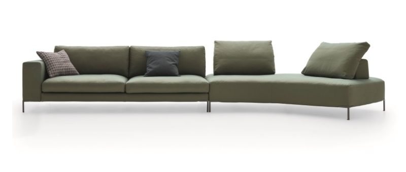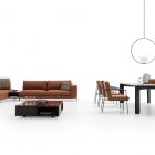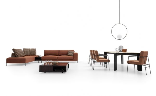 A modular system between suspended monocoque bases, mobile cushion bases, and coffee tables in two sizes. In the monocoque version, the free backrest allows vis-a-vis or double-sided configurations from the center of the room.