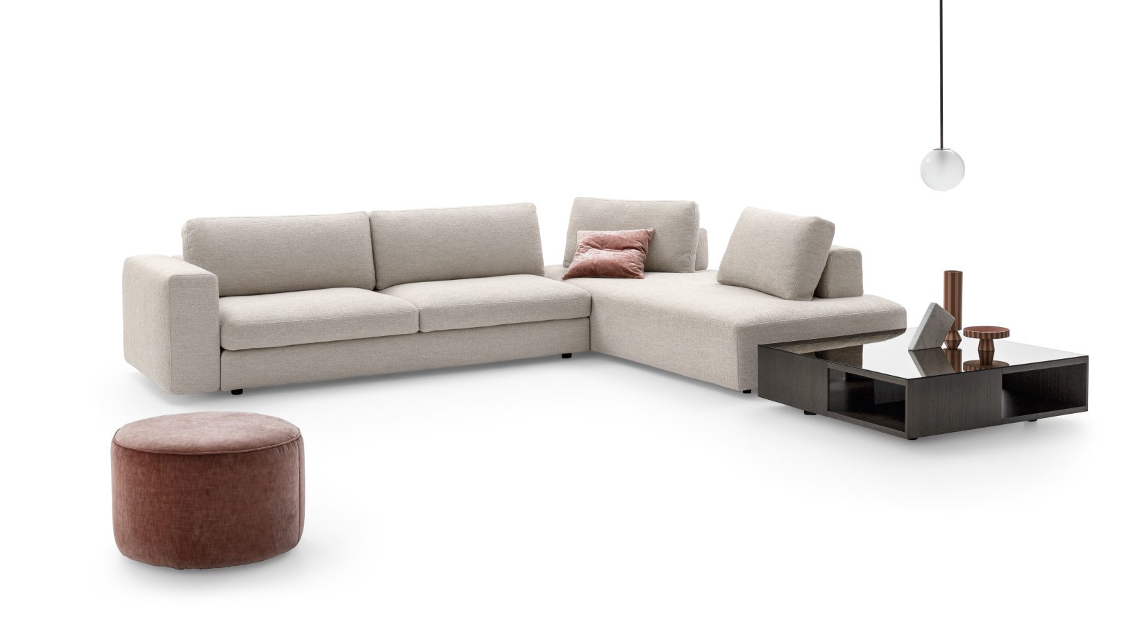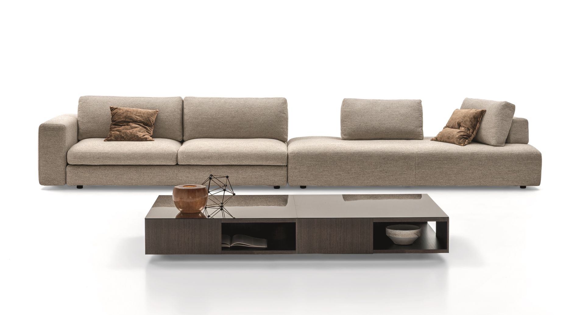 Reworked, Urban 2.0, becomes a widely versatile sofa system, with essential and elegant lines. Comfort and informality in the feather padding of both the free cushion modules and the monocoque bases.