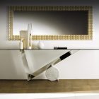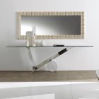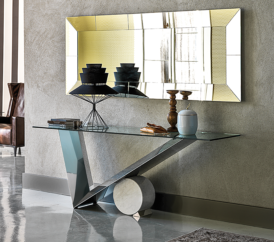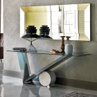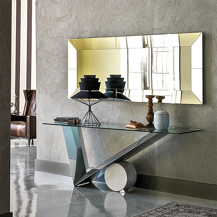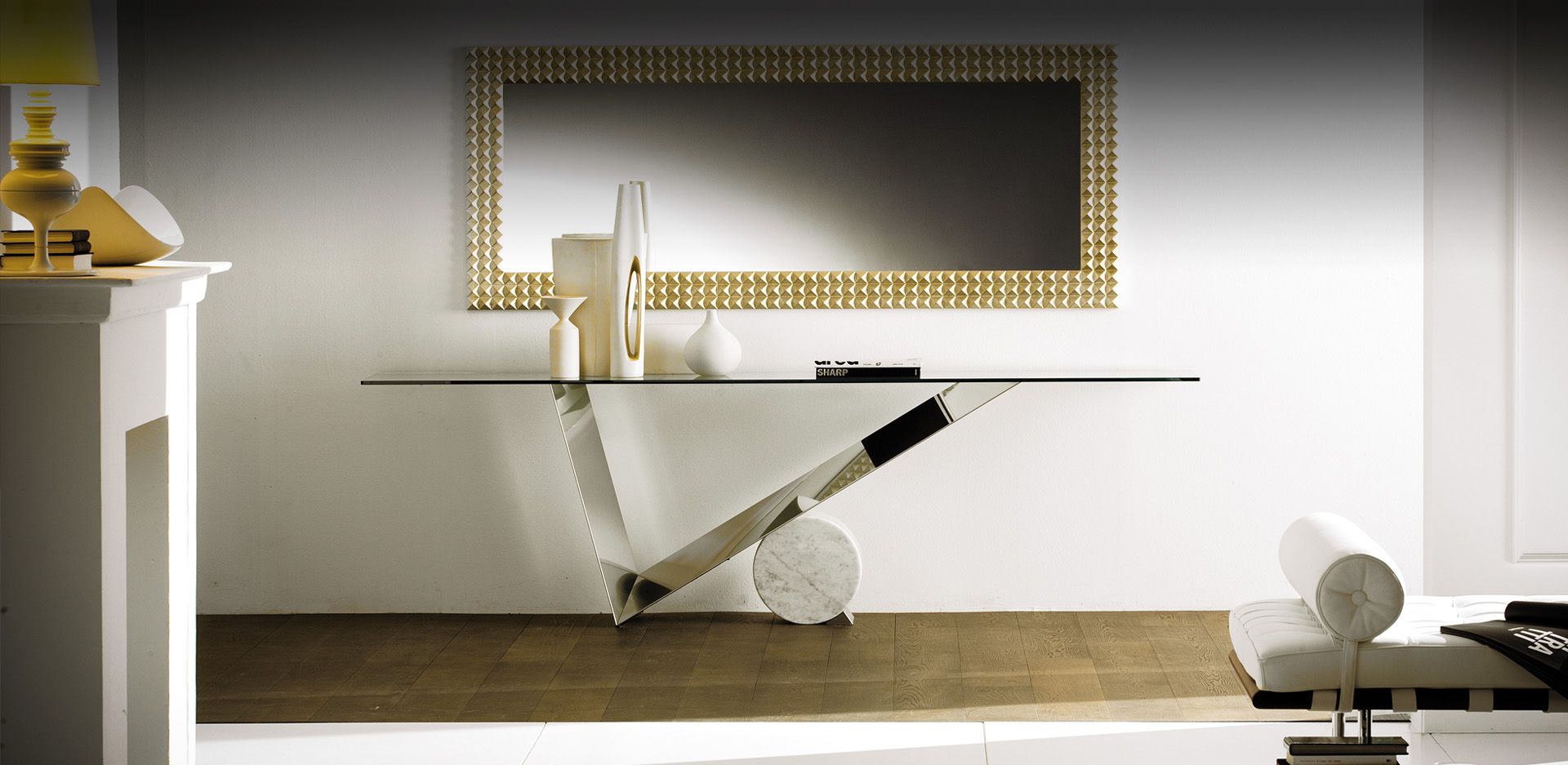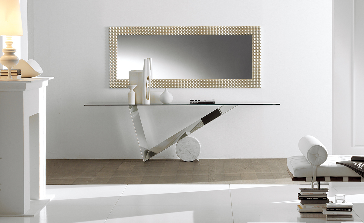 Emanuele Zenere designed the first model of the Valentino table in 1991. The product family expansion started at first with the Valentinox table and kept growing with two other omonimous console tables. The sculptural base combines volumes that seem to balance and support each other, while the glass top enlightens the different materials combination. The original design of this modern dining table, later used to conceive the Valentino wooden console table, presents a V-shaped volume made of precious wood essences, which lays on a marble cylinder. While the Valentinox console table and glass table, have a polished stainless steel V-shaped base.