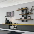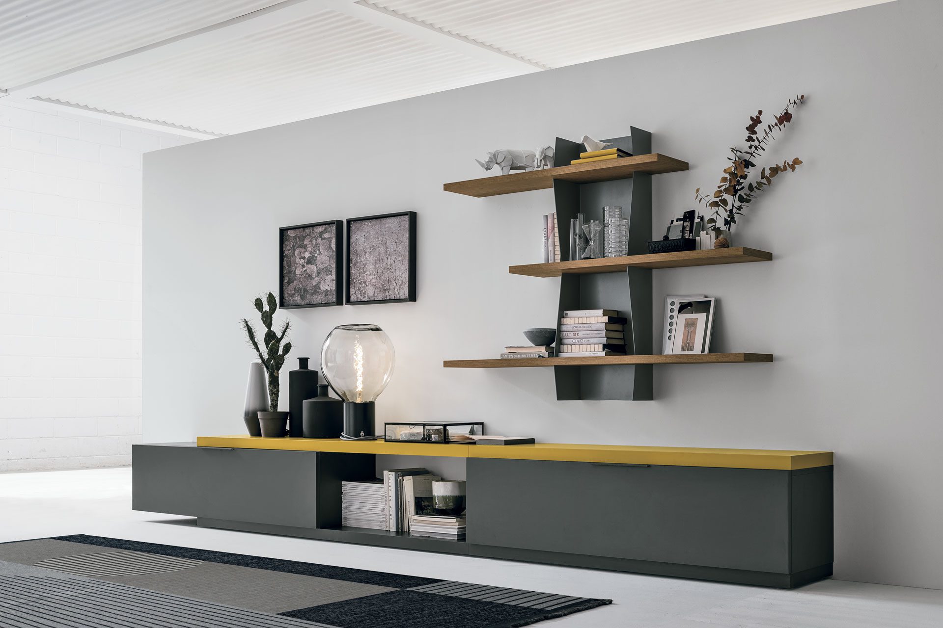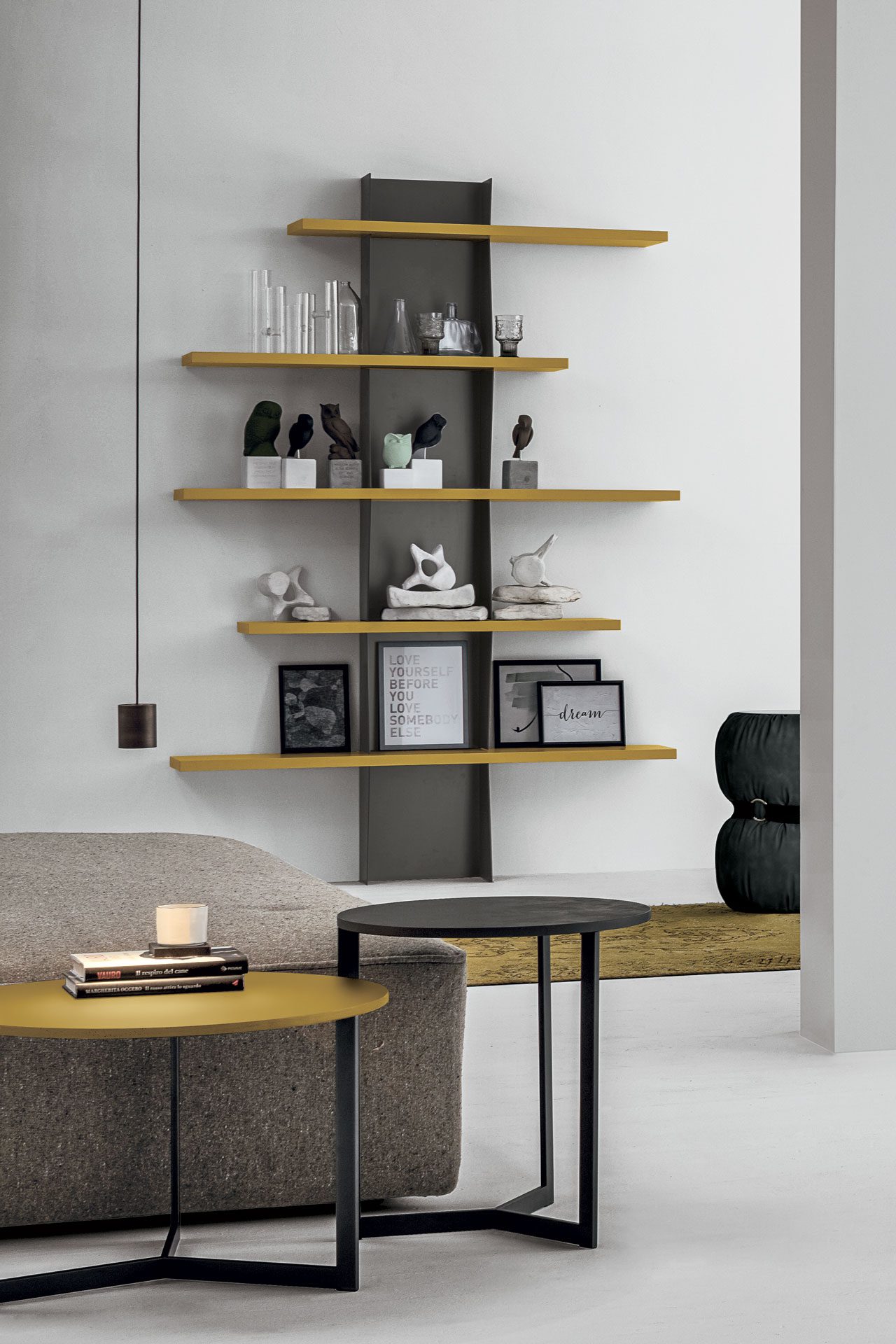 A metal wall element interposed with shelves in different finishes that expresses a new way of perceiving a bookcase: modular, versatile and dynamic. The sides of the central column become practical bookends and at the same time frames for displaying objects or pictures.