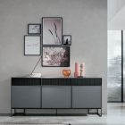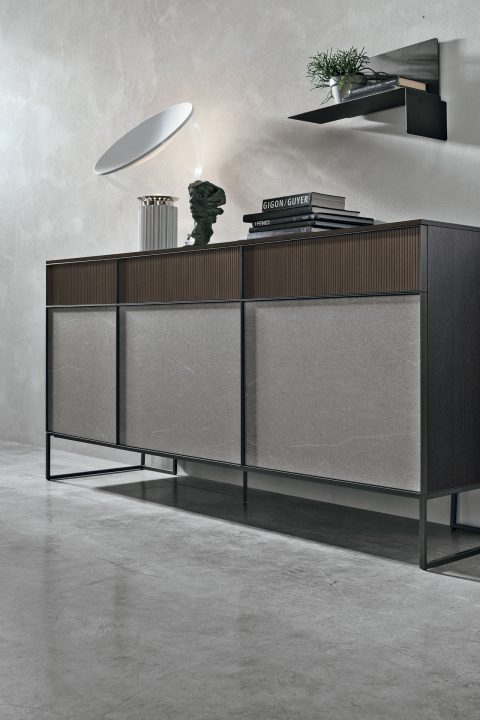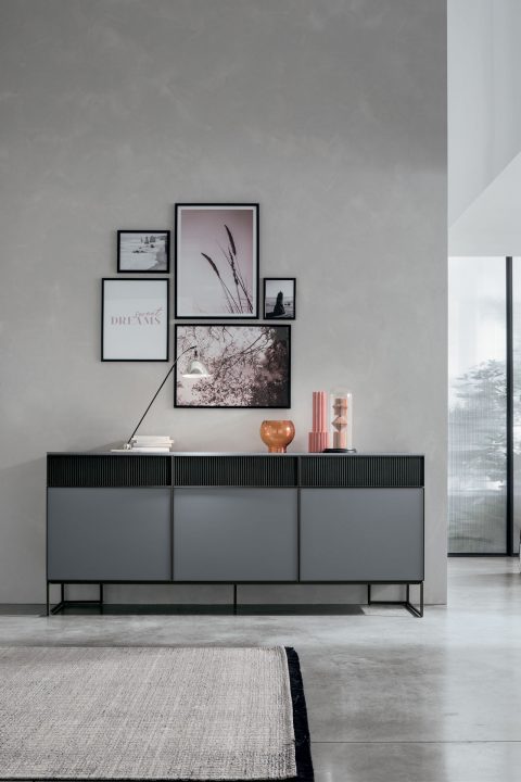 Vinci A04 sideboard with reeded coal oak drawer. Matt bromite 176 lacquered carcass and doors. Anthracite 160 metal trim and base.