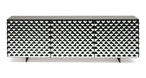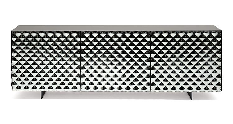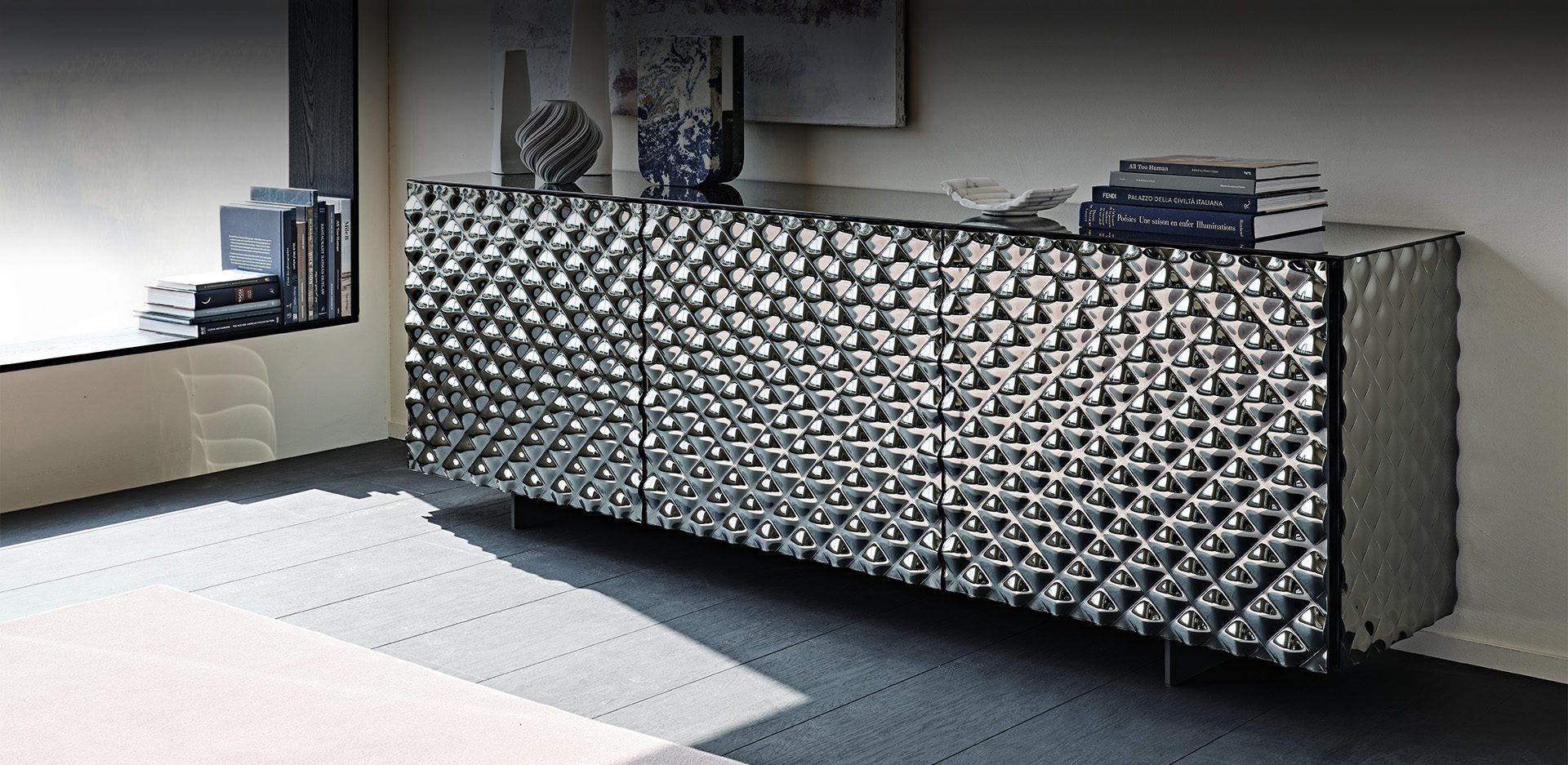 Made by the four hands of Paolo Cattelan and Lorenzo Remedi, the Vivaldi modern sideboard has an unparalleled hypnotic charm. The doors create a play of soft reflections, in which the surrounding objects and light sources reverberate. The front finish of this design sideboard consists of finely worked couture mirrored glass. The glass is shaped with an unprecedented technique that gives the surface a three-dimensional effect like quilting on fabric. Glass was chosen for the countertop, which reflects the objects displayed on this seductive mirrored sideboard.