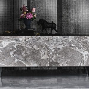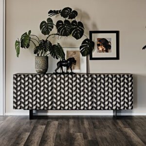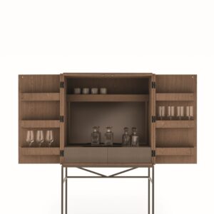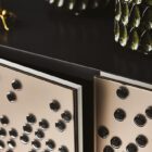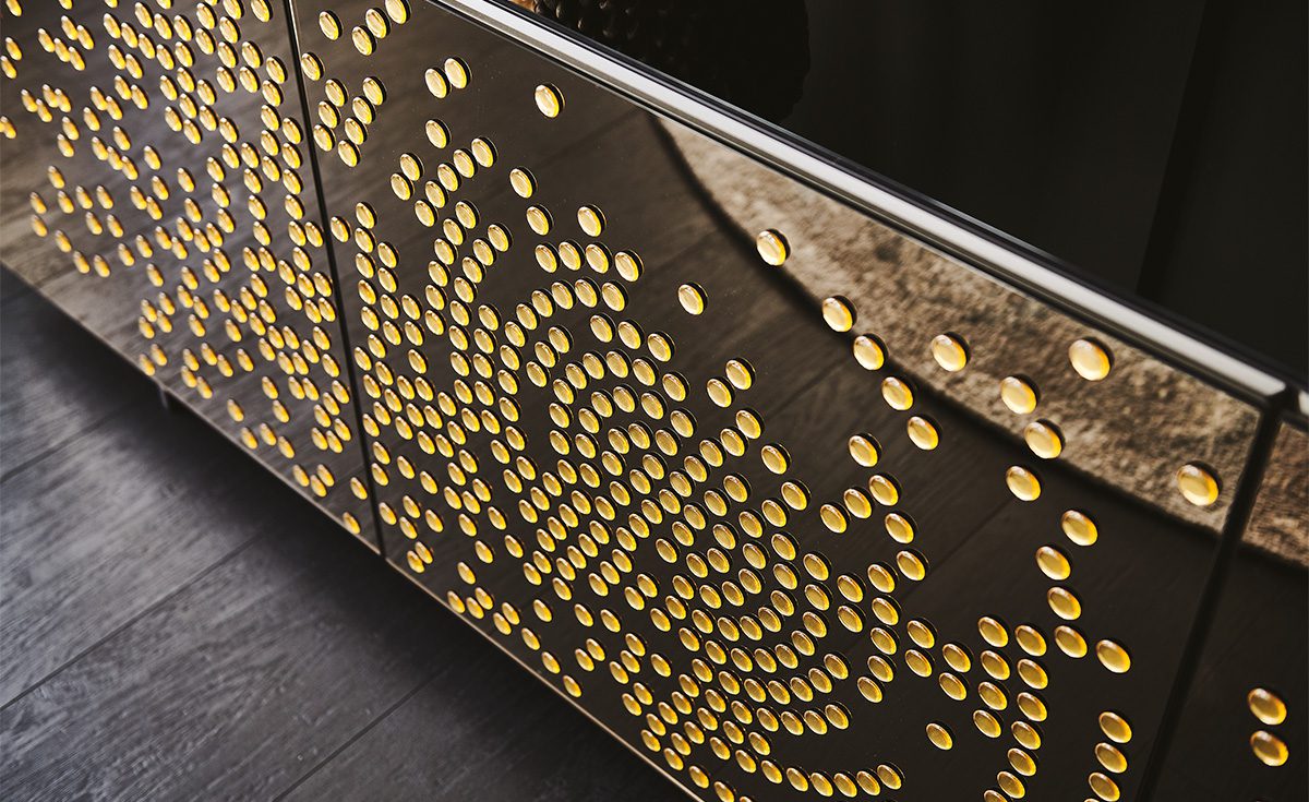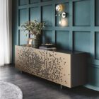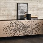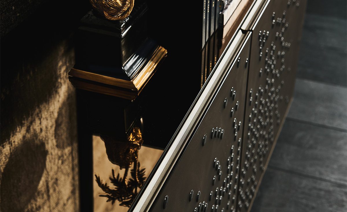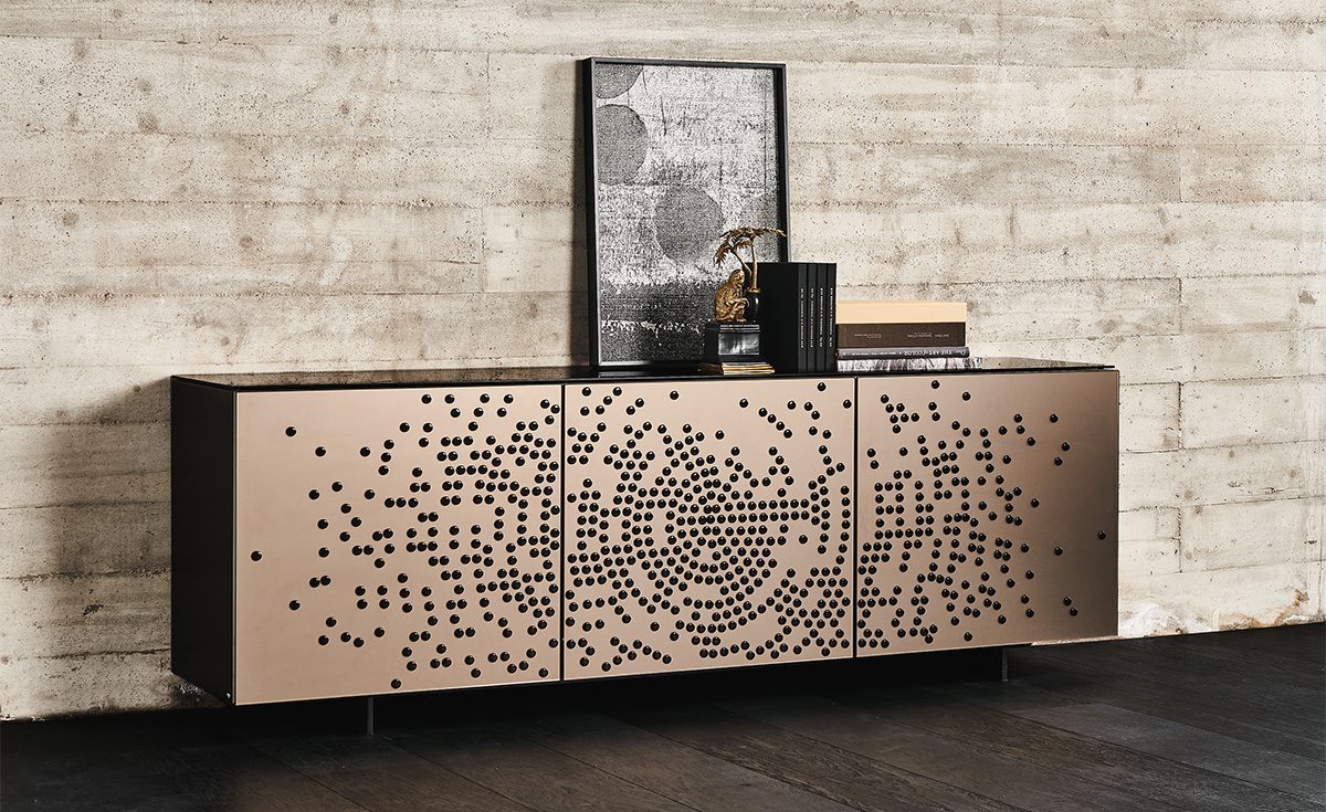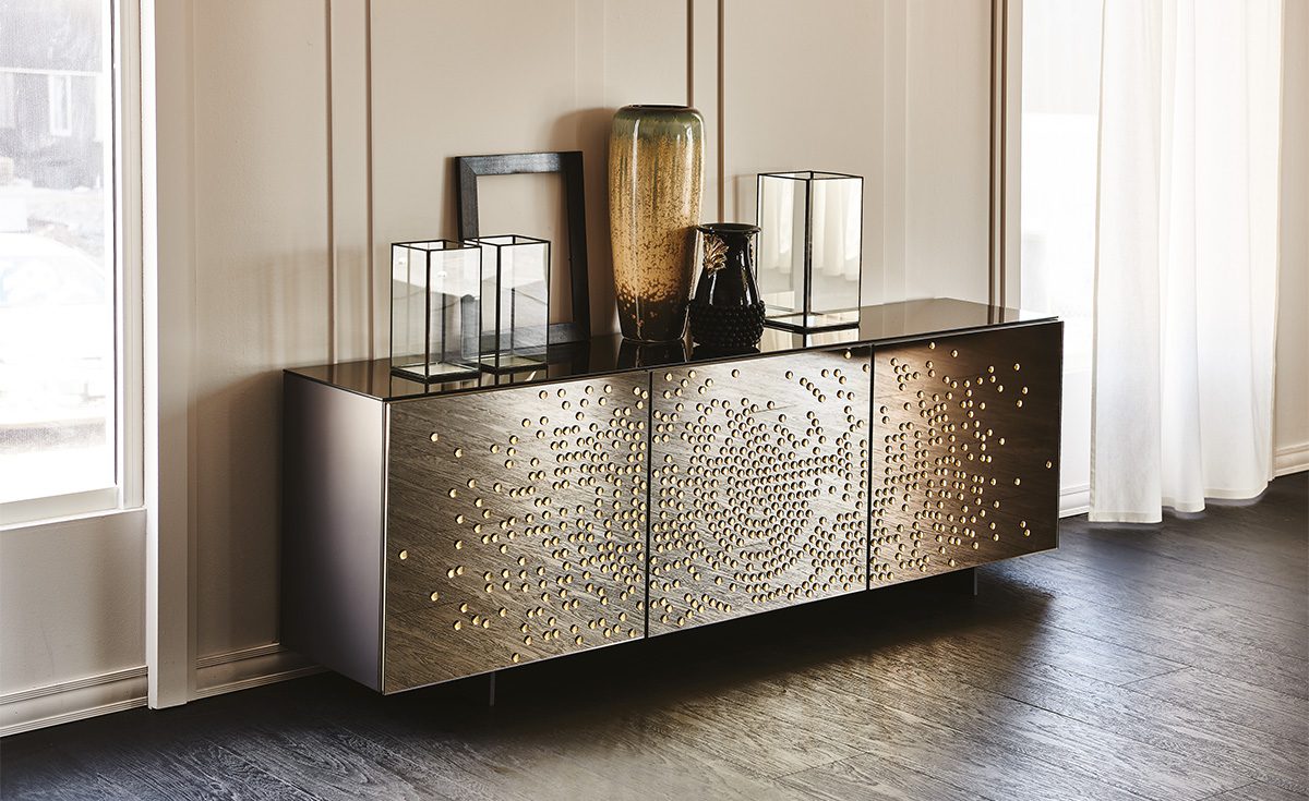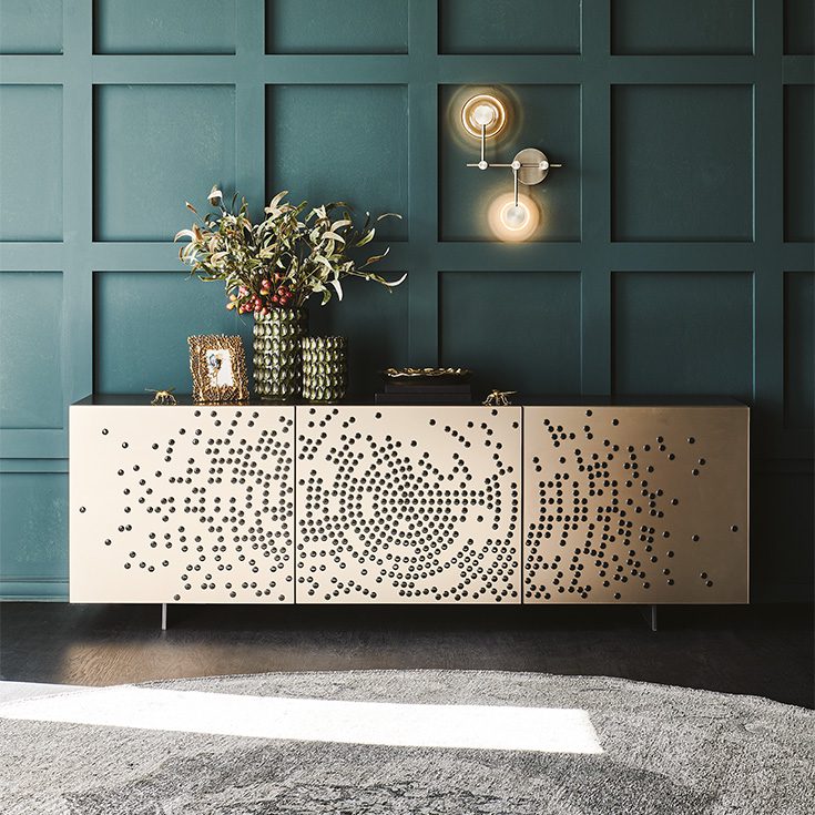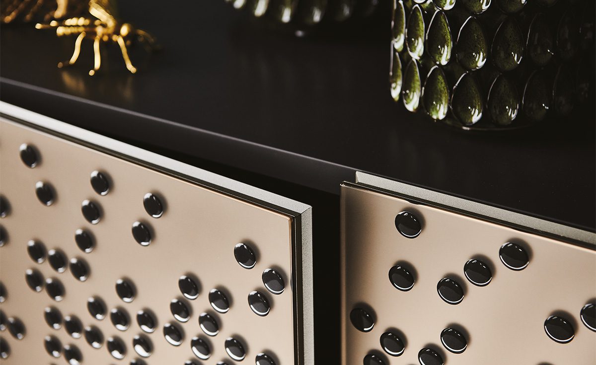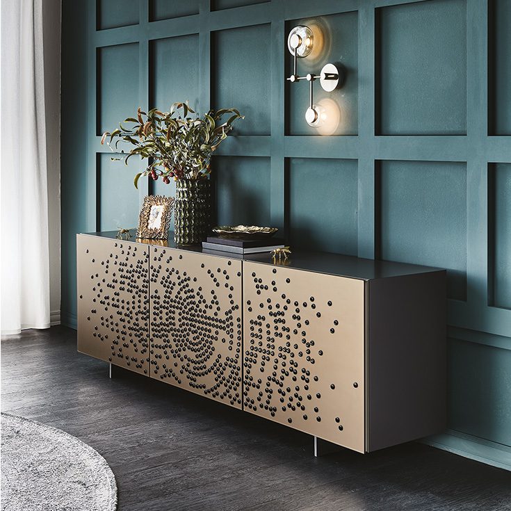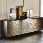 The design is ultra decorative, being eclectic and sculptured. The Voyager sideboard is a piece of furniture to be admired, taking pride of place as the key item in the room. The embossed gold or glossy black decorations enhance the satin glass fronts, with transparent glass for the internal shelves. To make this designer sideboard even more functional, the options include the drawer that can be positioned on each of the doors. Available with 2 or 3 doors, the modern Voyager sideboard is made in two different heights, to easily adapt to various rooms in the house..