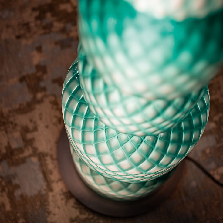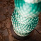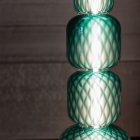 Floor lamp with frame in black (GFM73) embossed lacquered steel. Lampshades in artistic decorated Verde Pavone or Ambra Balloton glass. Led light.