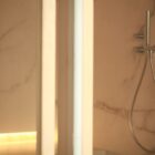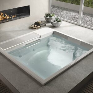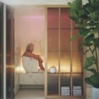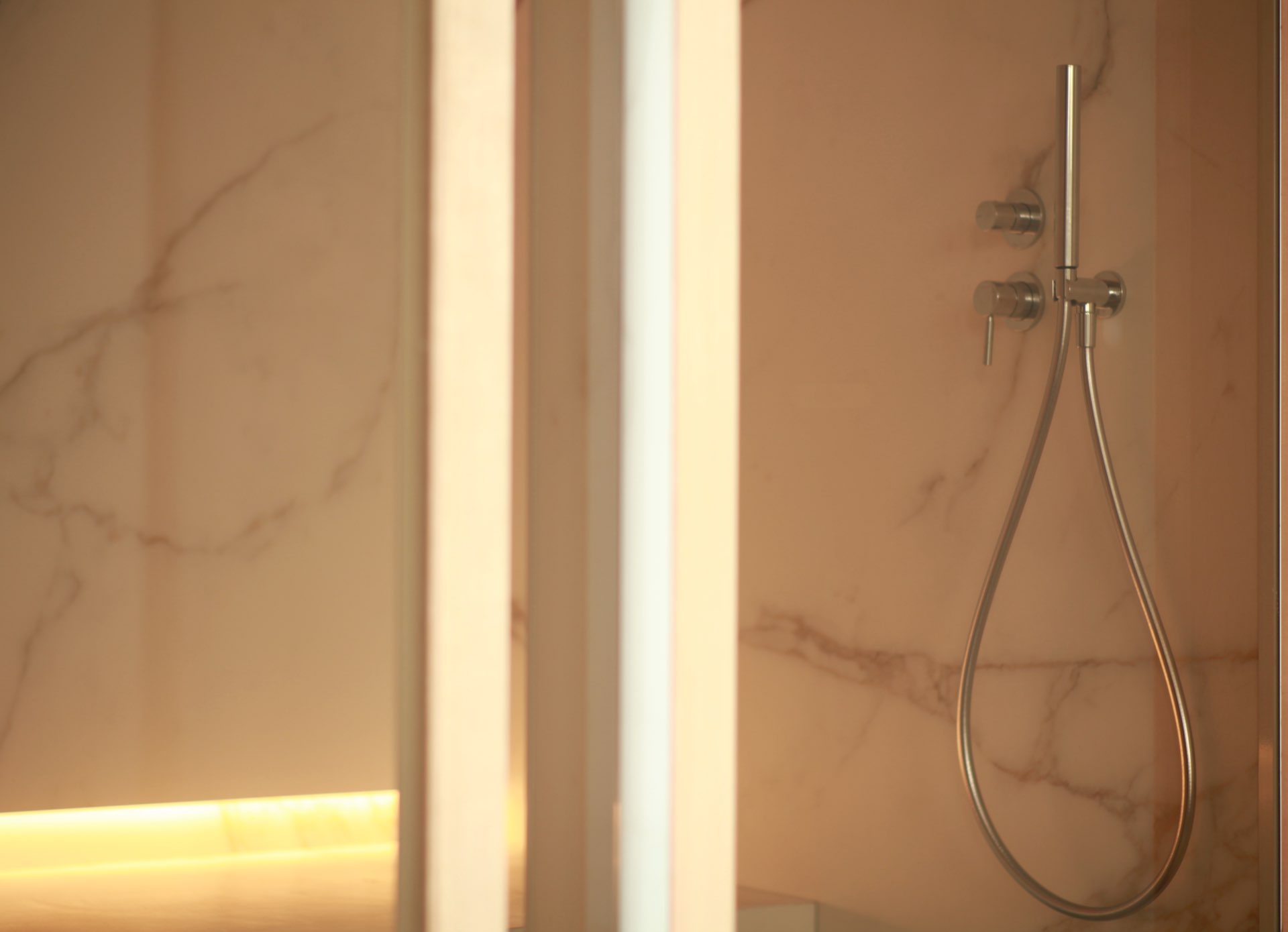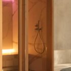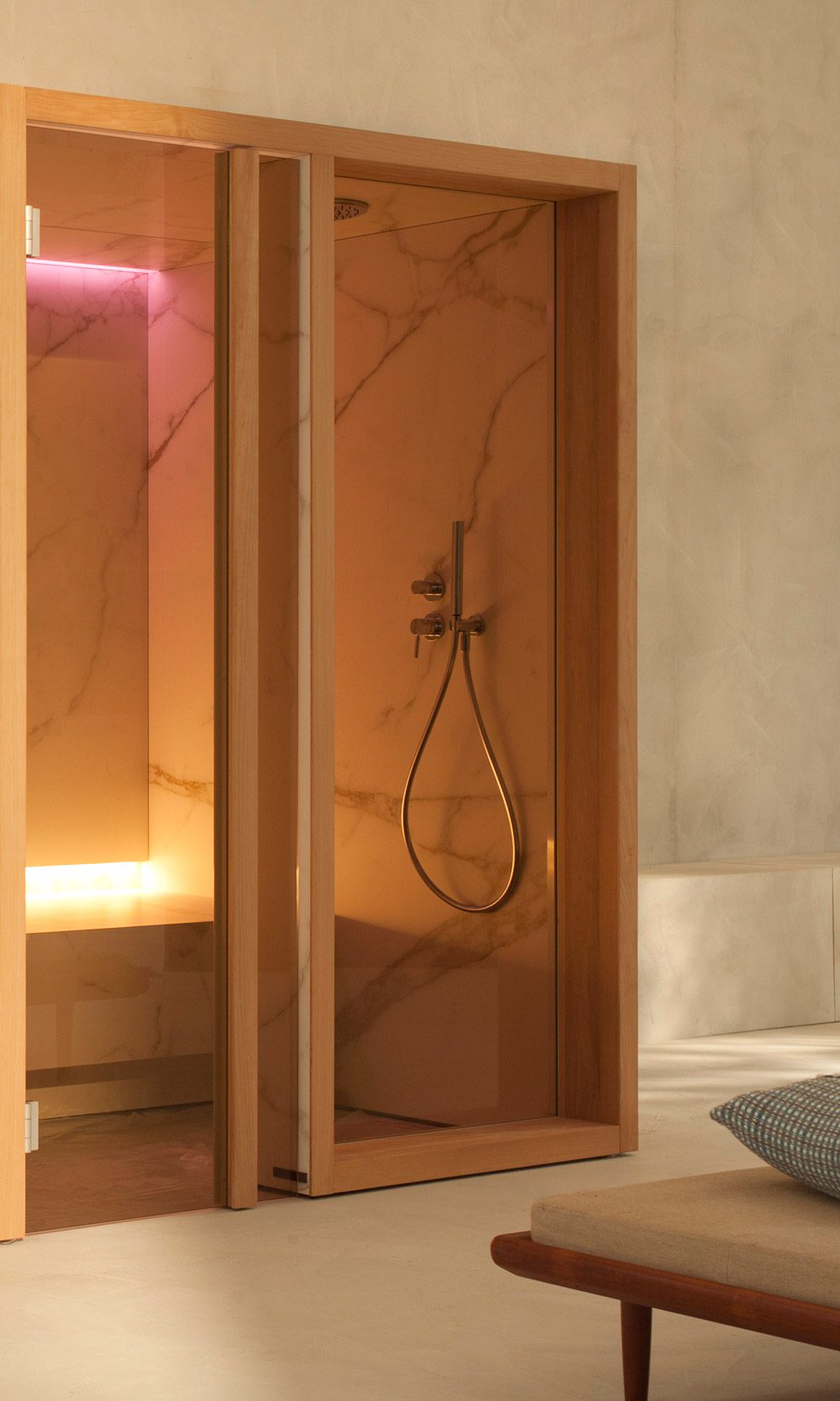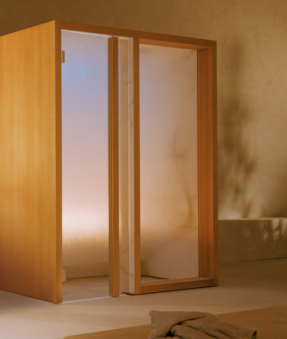 The key features of Yoku H are the large recessed glass wall in bronze smoked glass along the front and the vertical elements in natural wood which create the feeling of being outdoors, in the middle of a forest, bringing elegance and privacy to the heat experience. Inside the Hammam, comfort is provided by one single, very deep seat. The bookcase can also be used as a separate element outside, placing it next to the glass panels where it can act as a filter to create private, highly personalised spaces. The perfect Turkish bath is achieved when the density of the steam remains optimal and constant over time and the temperature is above 40°C. All Effe Hammam steam generators have a specified steam temperature and quantity to guarantee a truly relaxing experience and a product that will last.