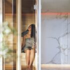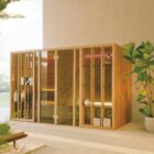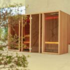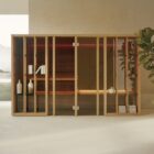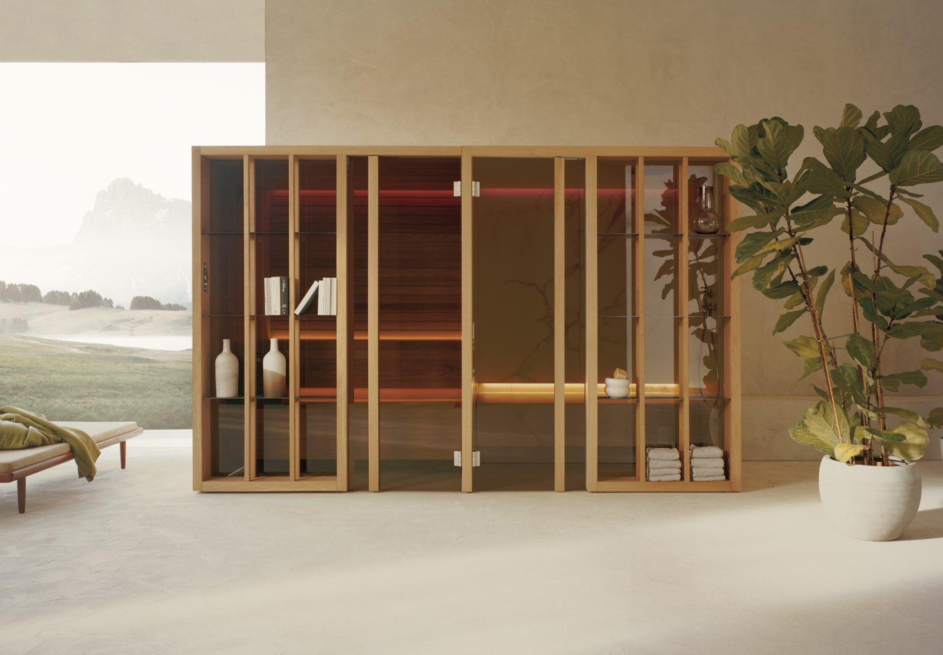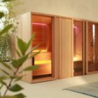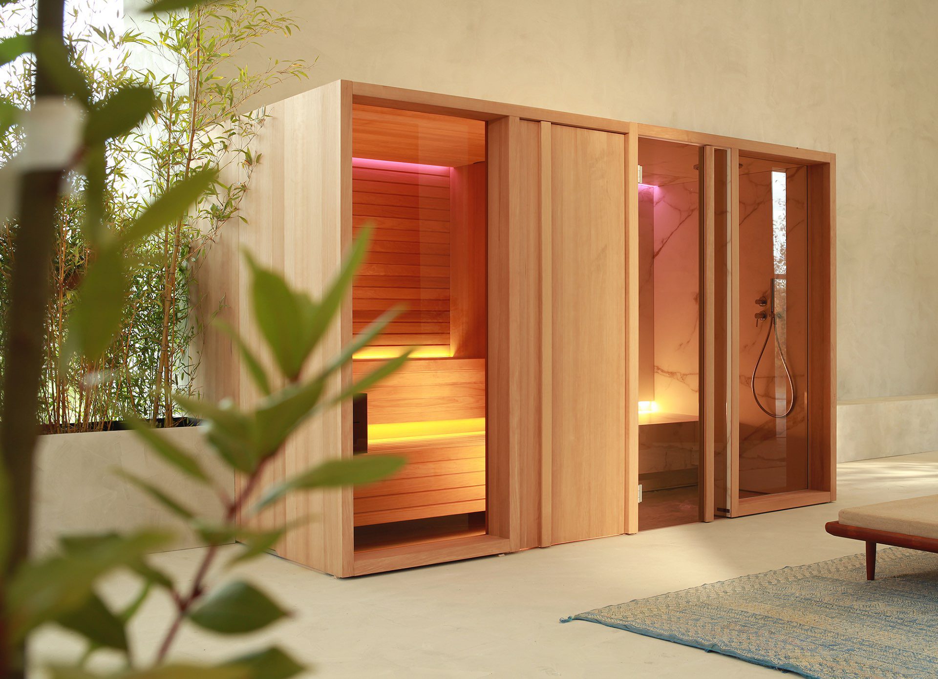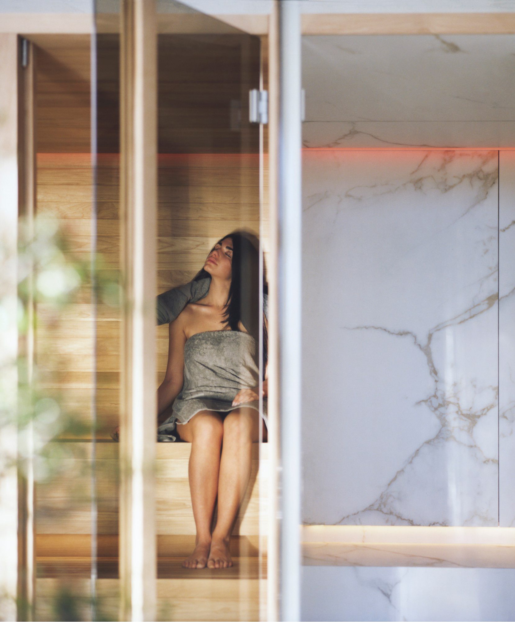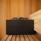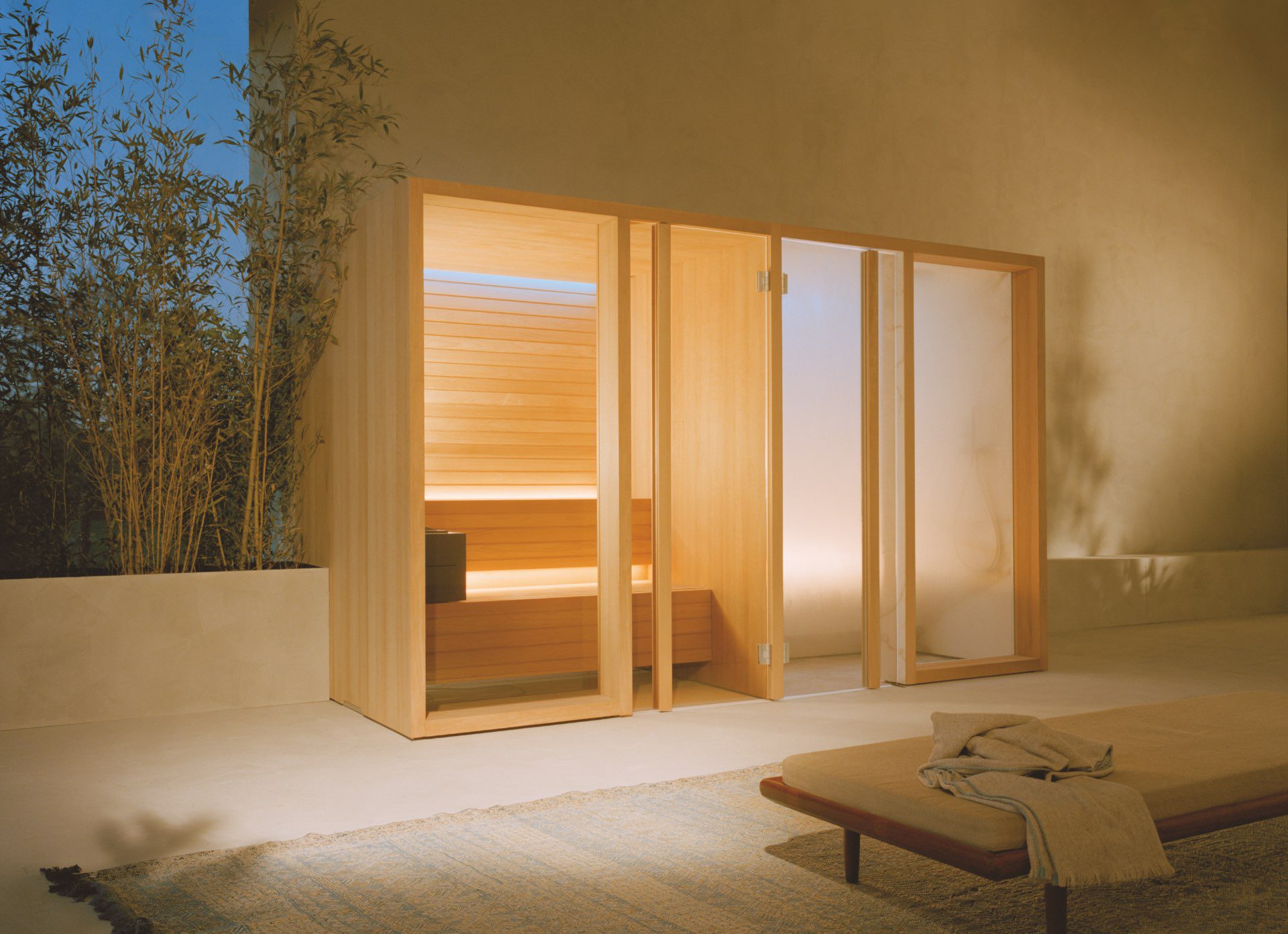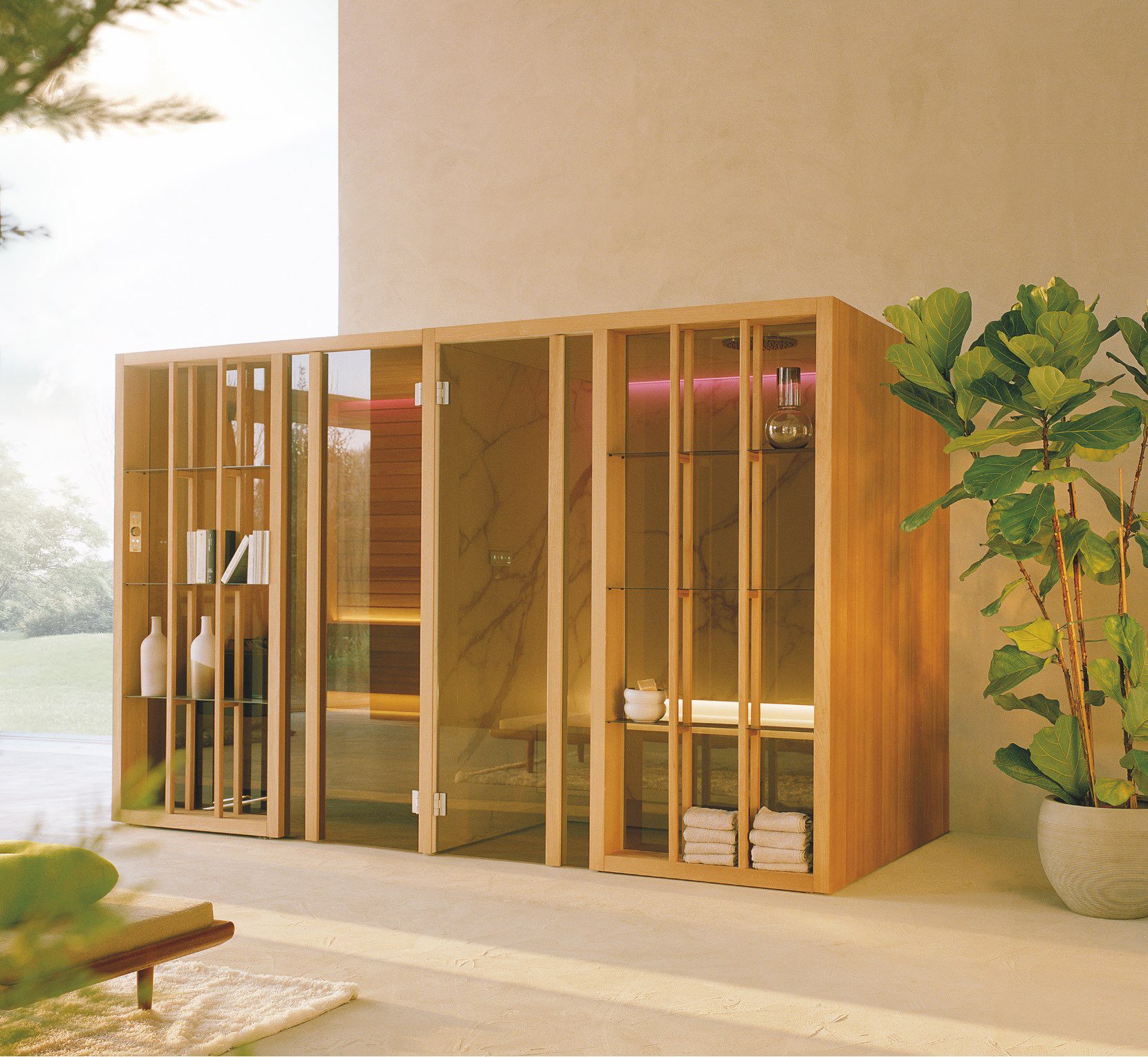 The key features of the Yoku SH system are the large recessed glass wall in bronze smoked glass along the front and the vertical elements in natural wood which create the feeling of being outdoors, in the middle of a forest, bringing elegance and privacy to the heat experience.