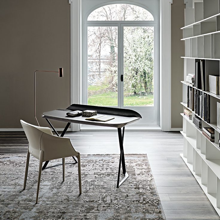 The Zuleika armrest chair, conceived by studio Archirivolto, shows a traditional aesthetic, even though it has an incisive elegance. The stitchings on the profile match the integral leather covering, enhancing the elaborate structure of this elegant modern chair. The back legs that stick out of the backrest give a taller and lighter look to the whole seat.